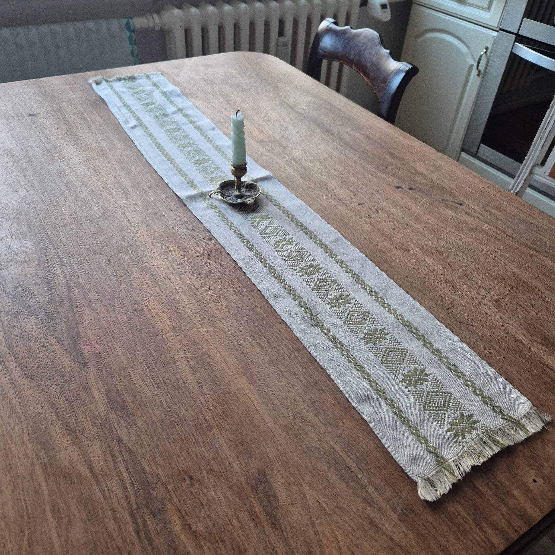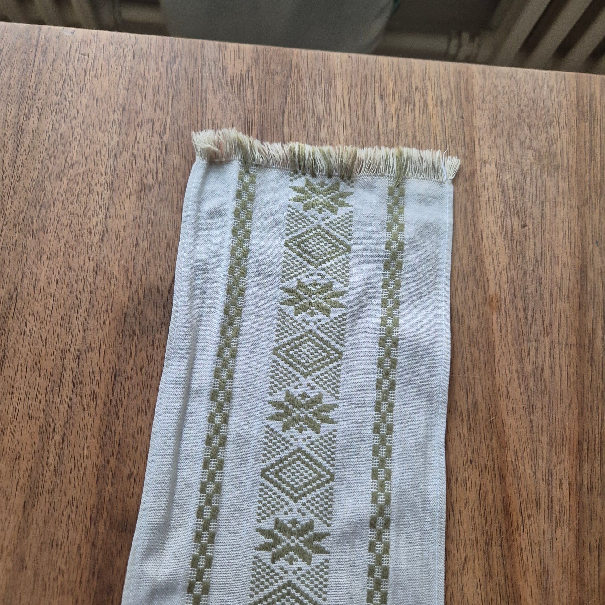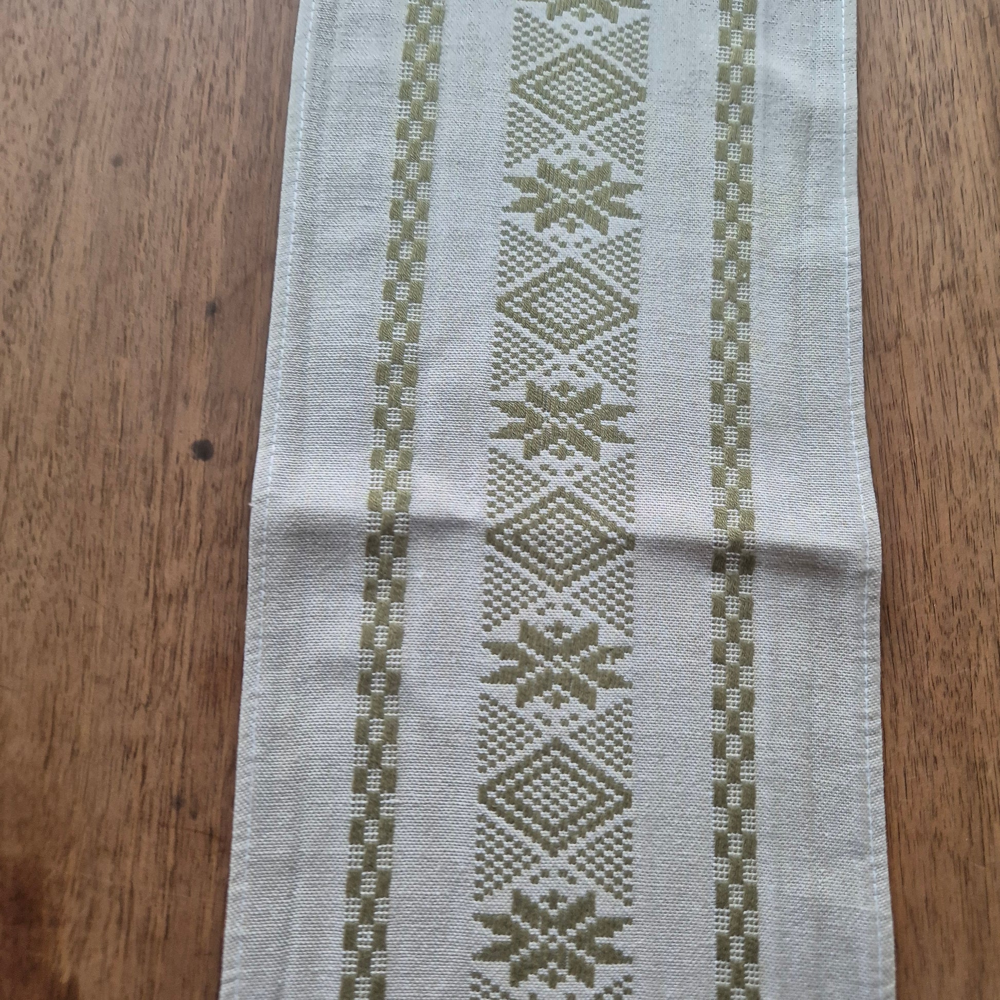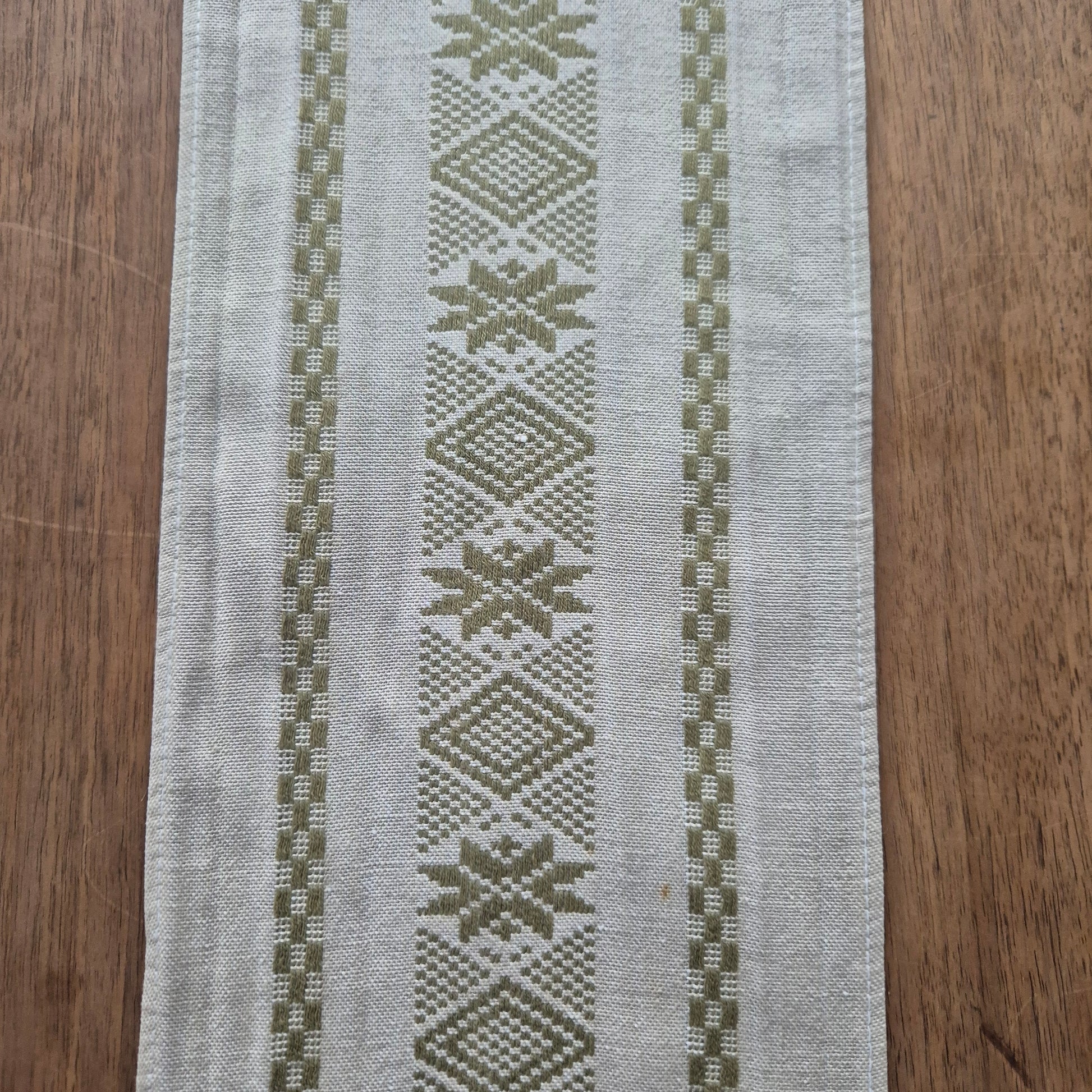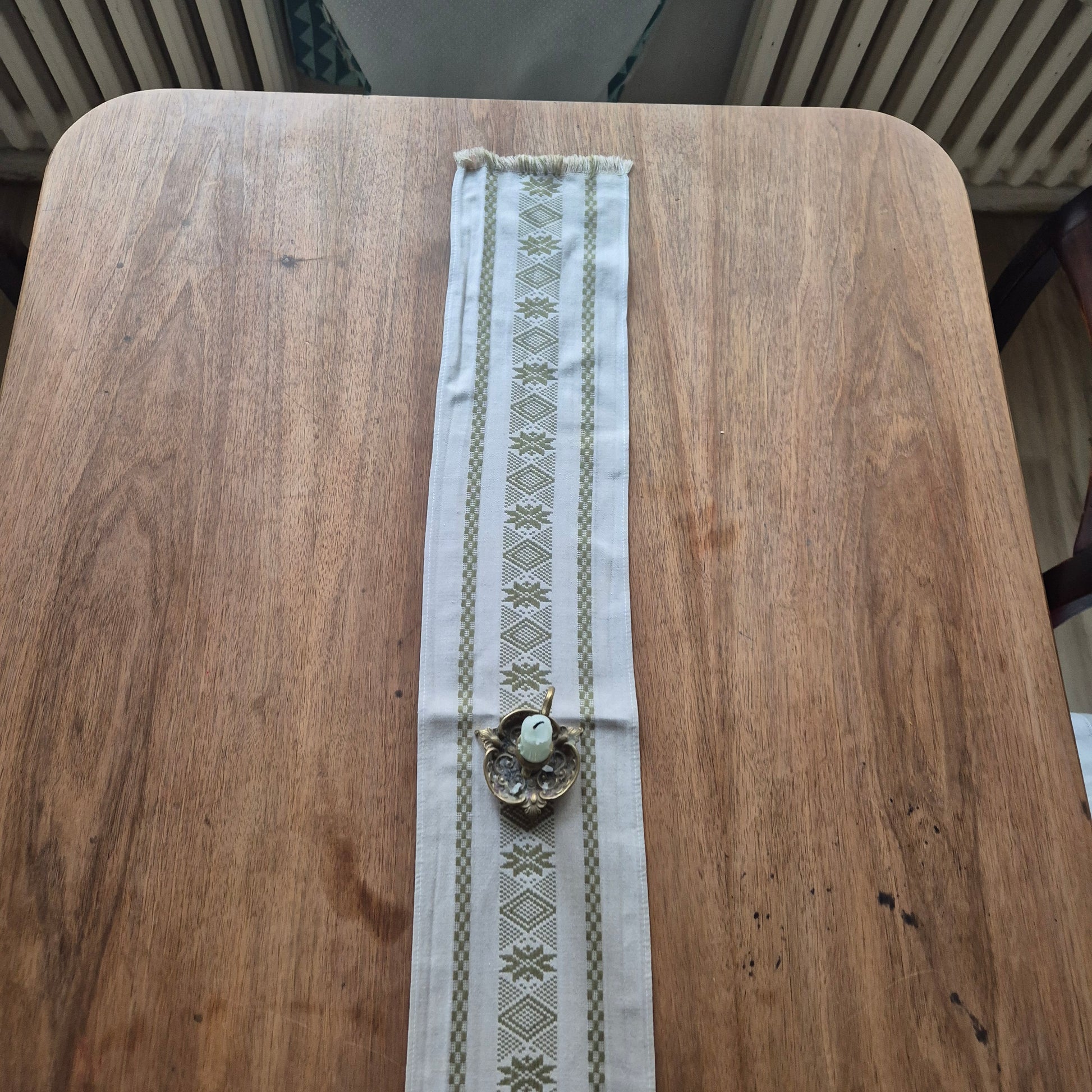 Mit seinem verspielten Grünton und der kompakten Größe von 16,5 cm x 107 cm bringt dieser alte Vintage Mini Läufer frischen Wind und nostalgischen Charme in deine Räume. Ob als bunter Akzent auf dem Tisch oder als charmante Dekoidee – dieser Läufer sorgt garantiert für gute Laune und ein einzigartiges Vintage-Flair!