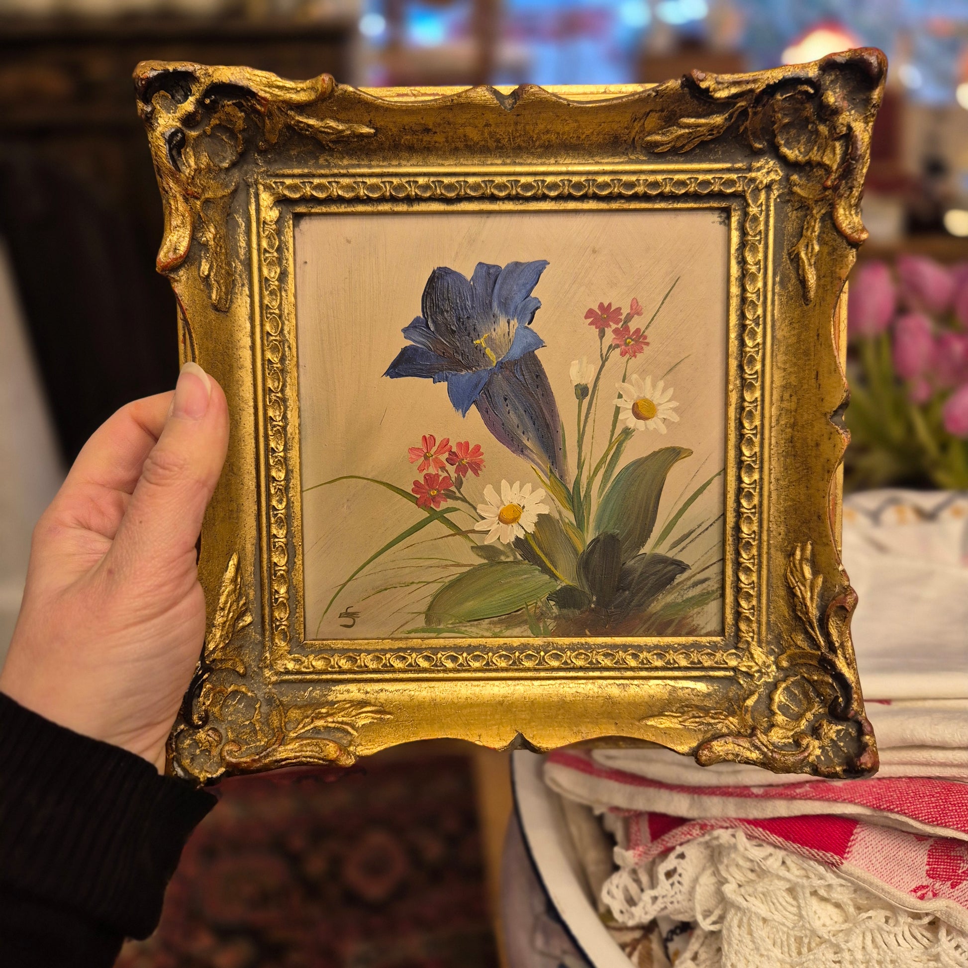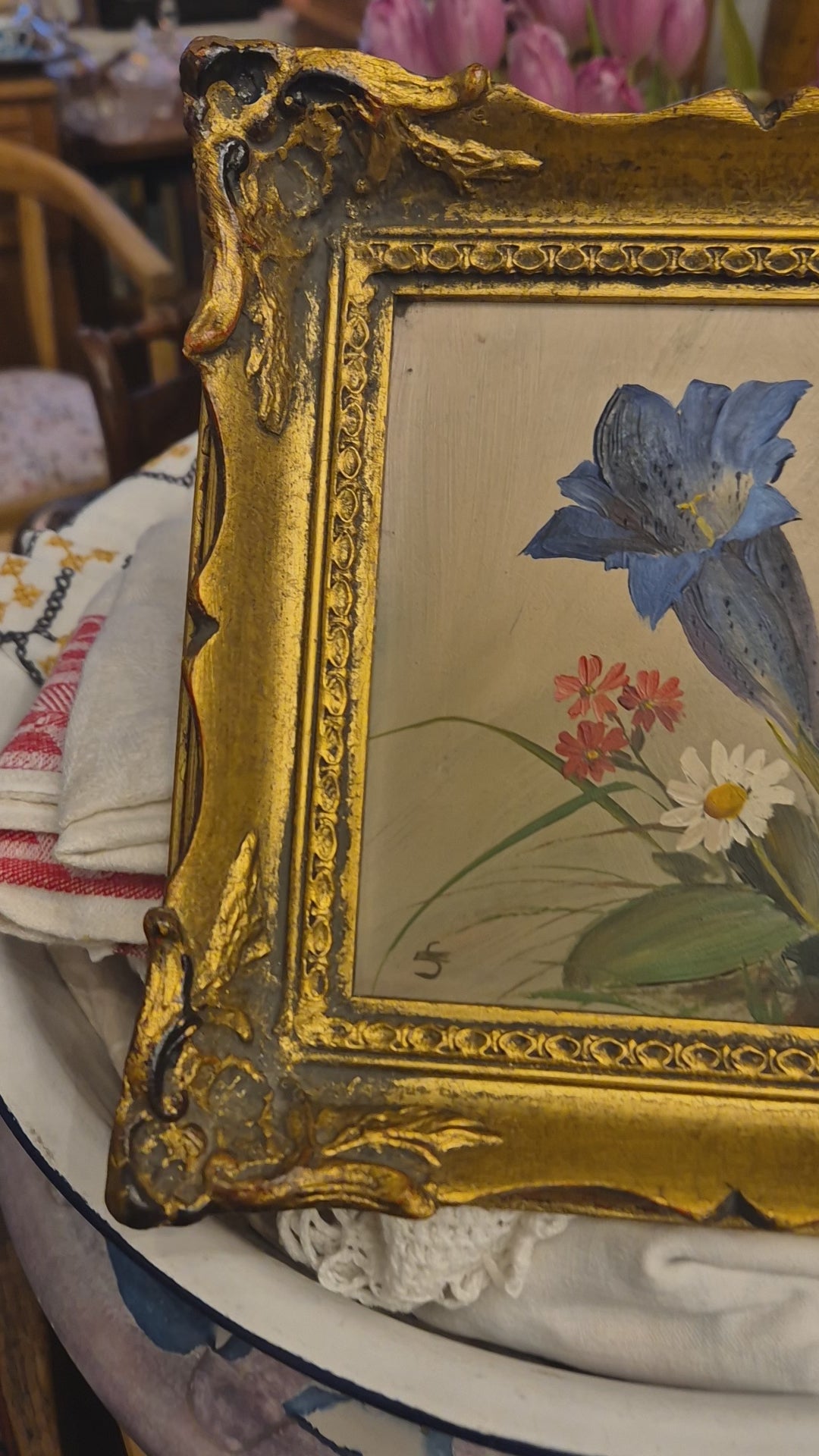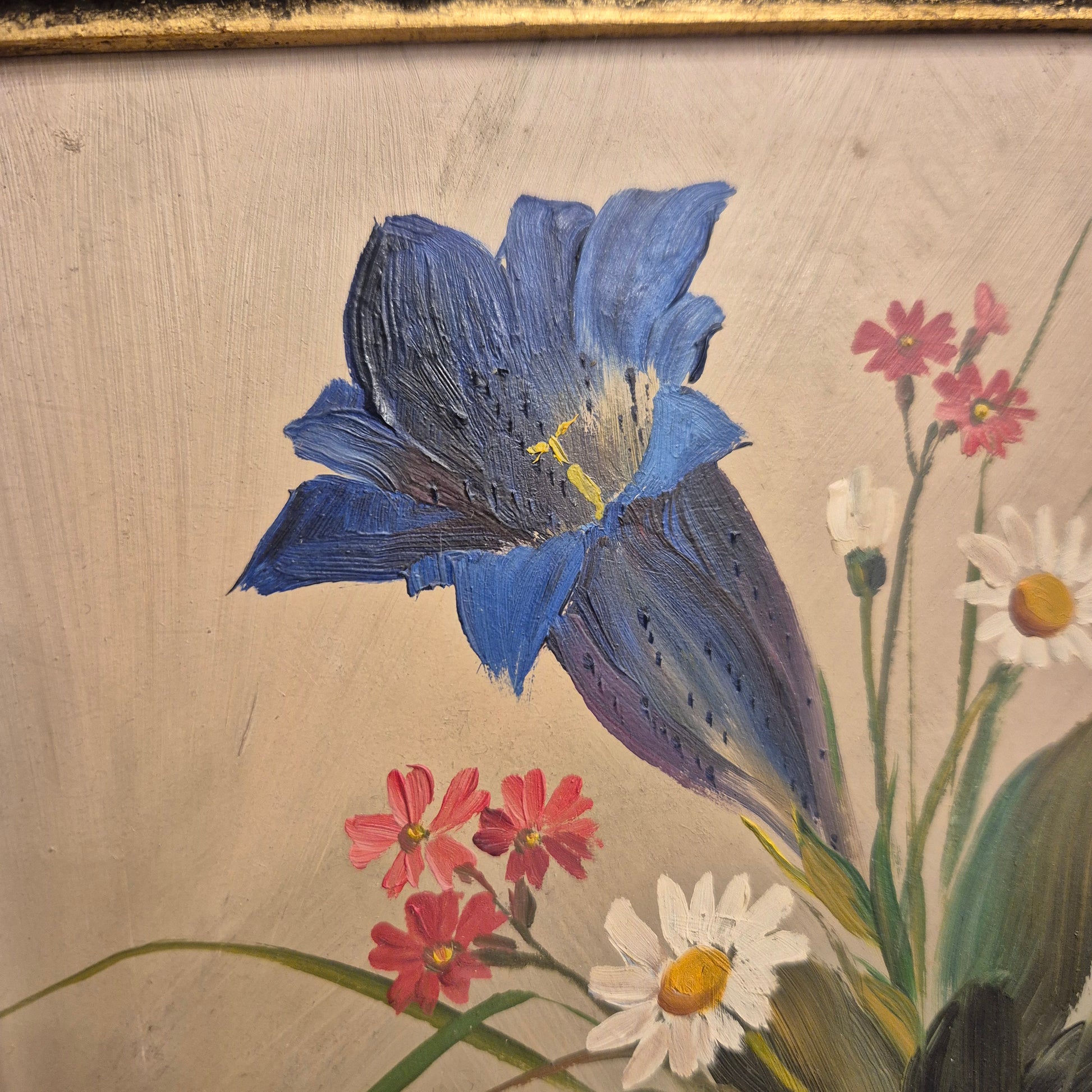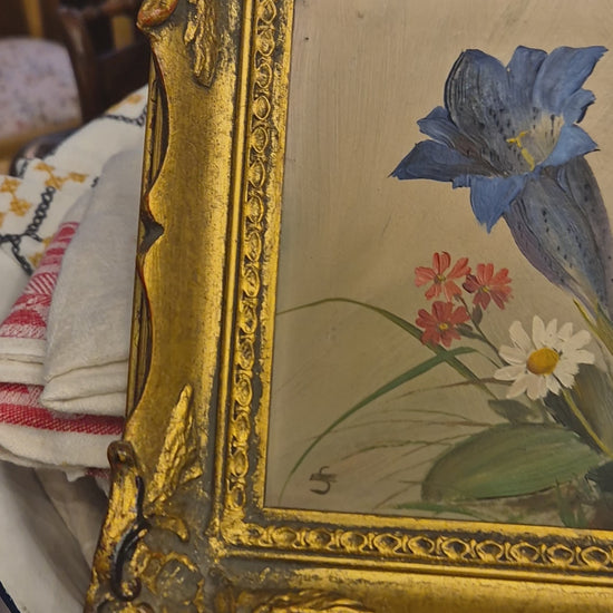 Altes gerahmtes Blumenbild blauer Enzian im Barock Stil Ölmalerei