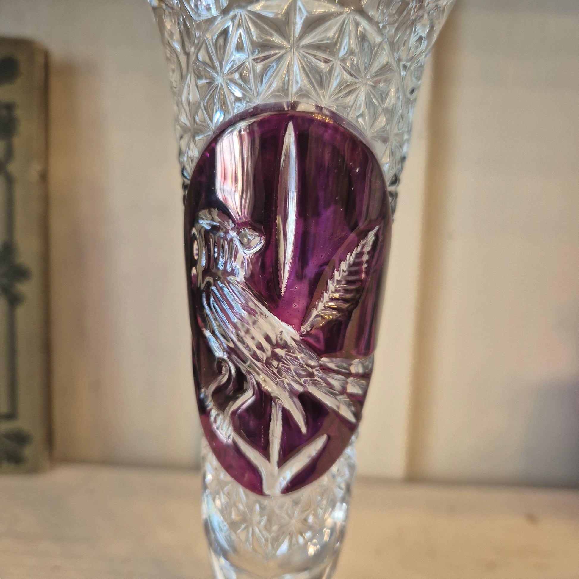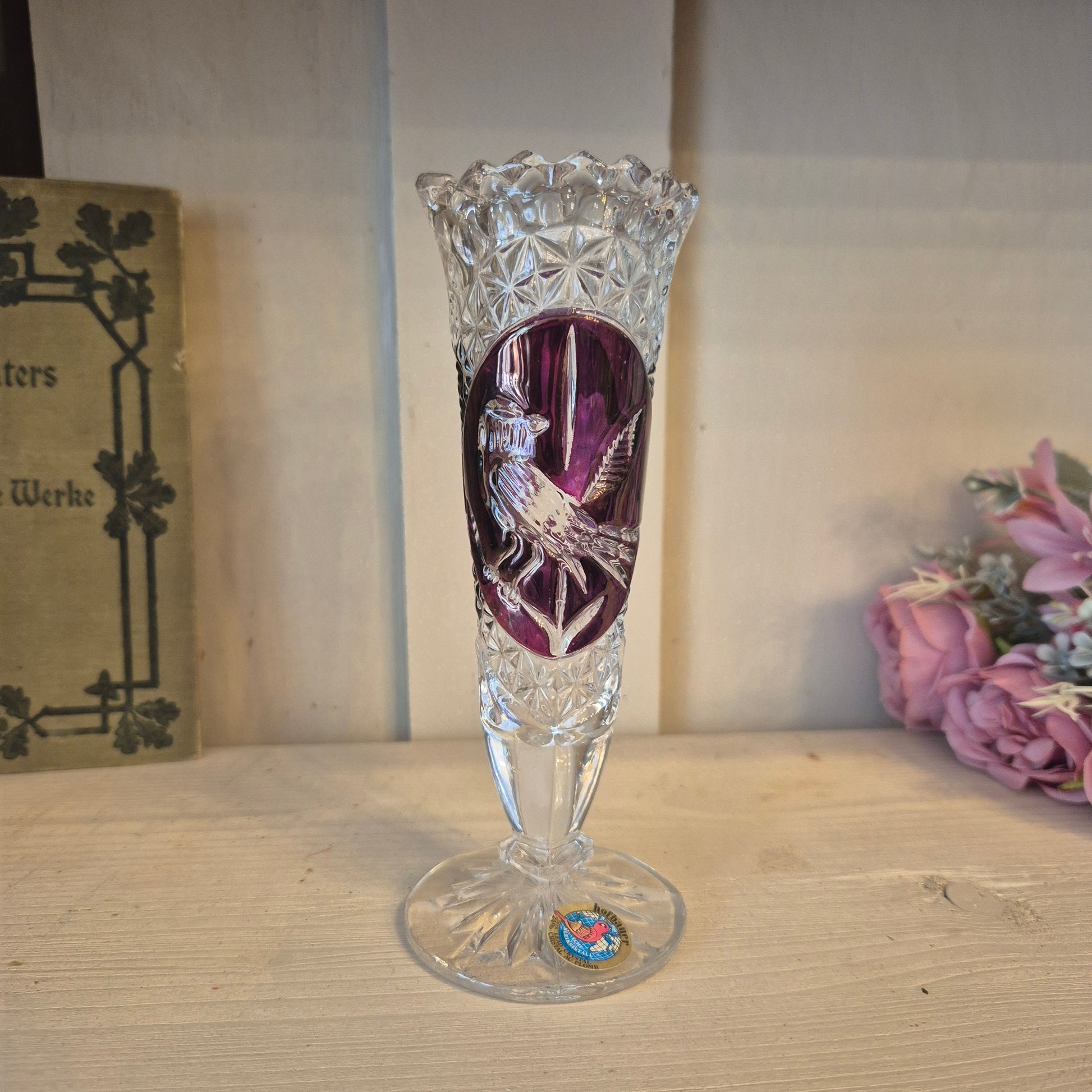 Vintage Bleikristall Hofbauer kleine Vase mit Vogelmotiv Weinrot