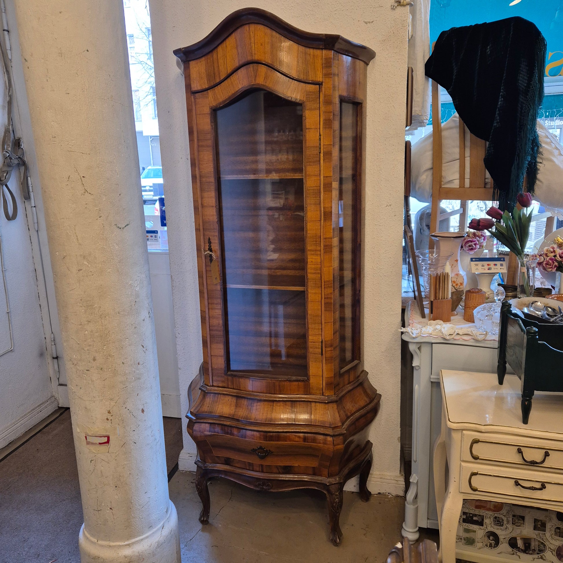 Diese wunderschöne Vitrine im Barock Stil wurde vor ca. 100 Jahren handgemacht und befindet sich dementsprechend in einem guten Zustand! Sie ist furniert und hat praktischerweise eine kleine Schublade. Perfekt für eine Sammlung oder Bücher. Hier und da sind einige charmante Gebrauchsspuren, siehe Fotos. Bei Fragen einfach per EMail kontaktieren oder anrufen.