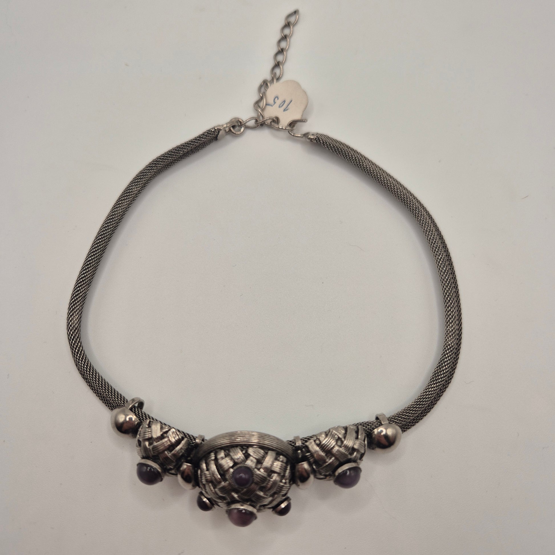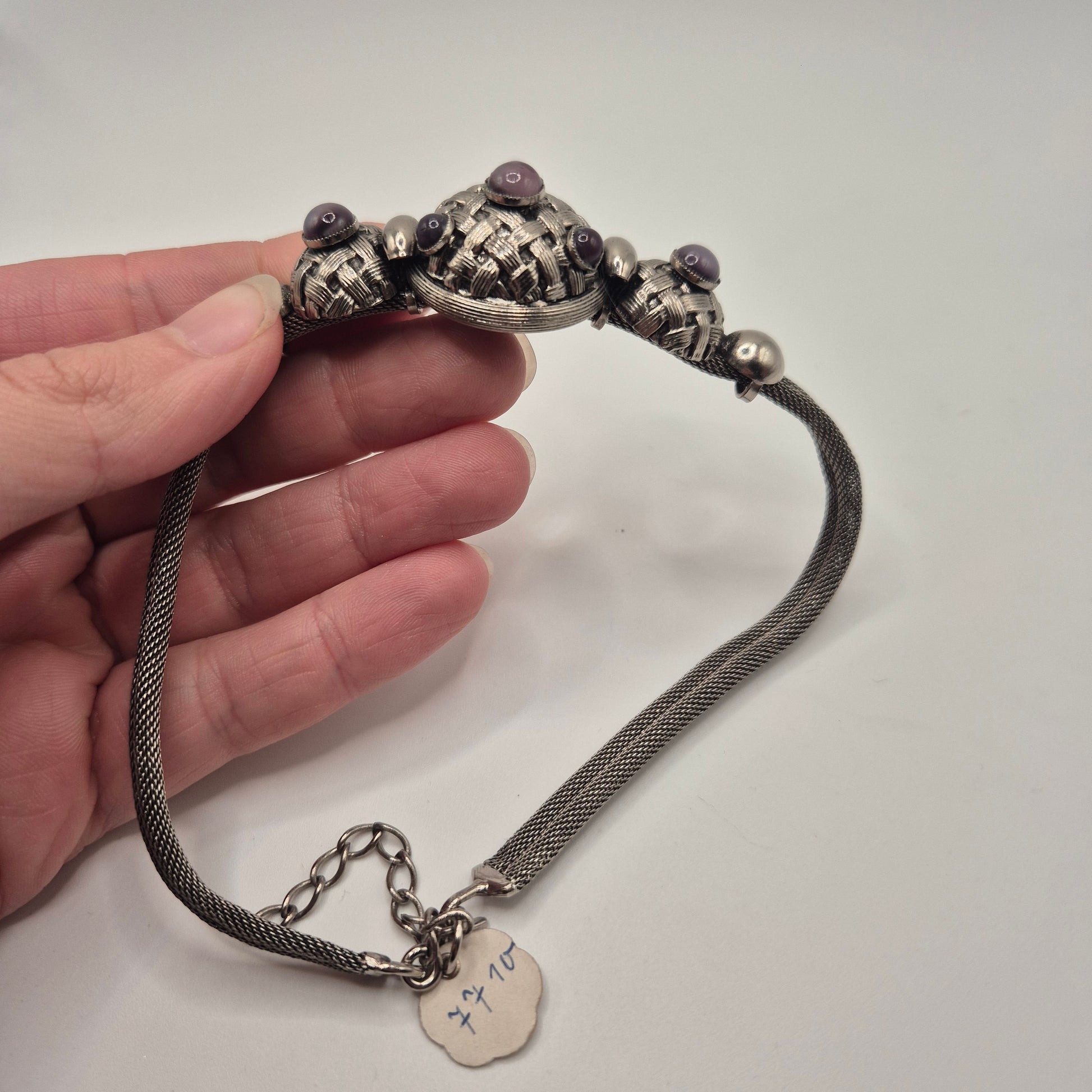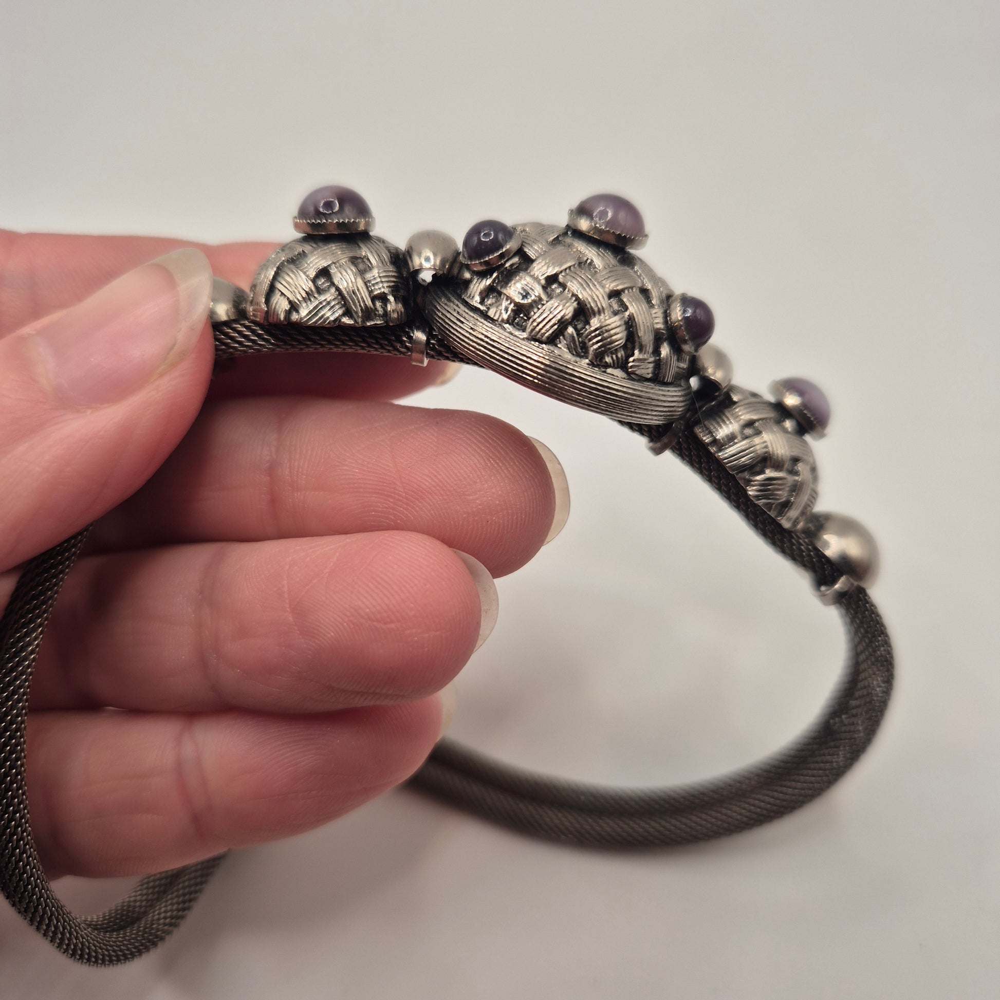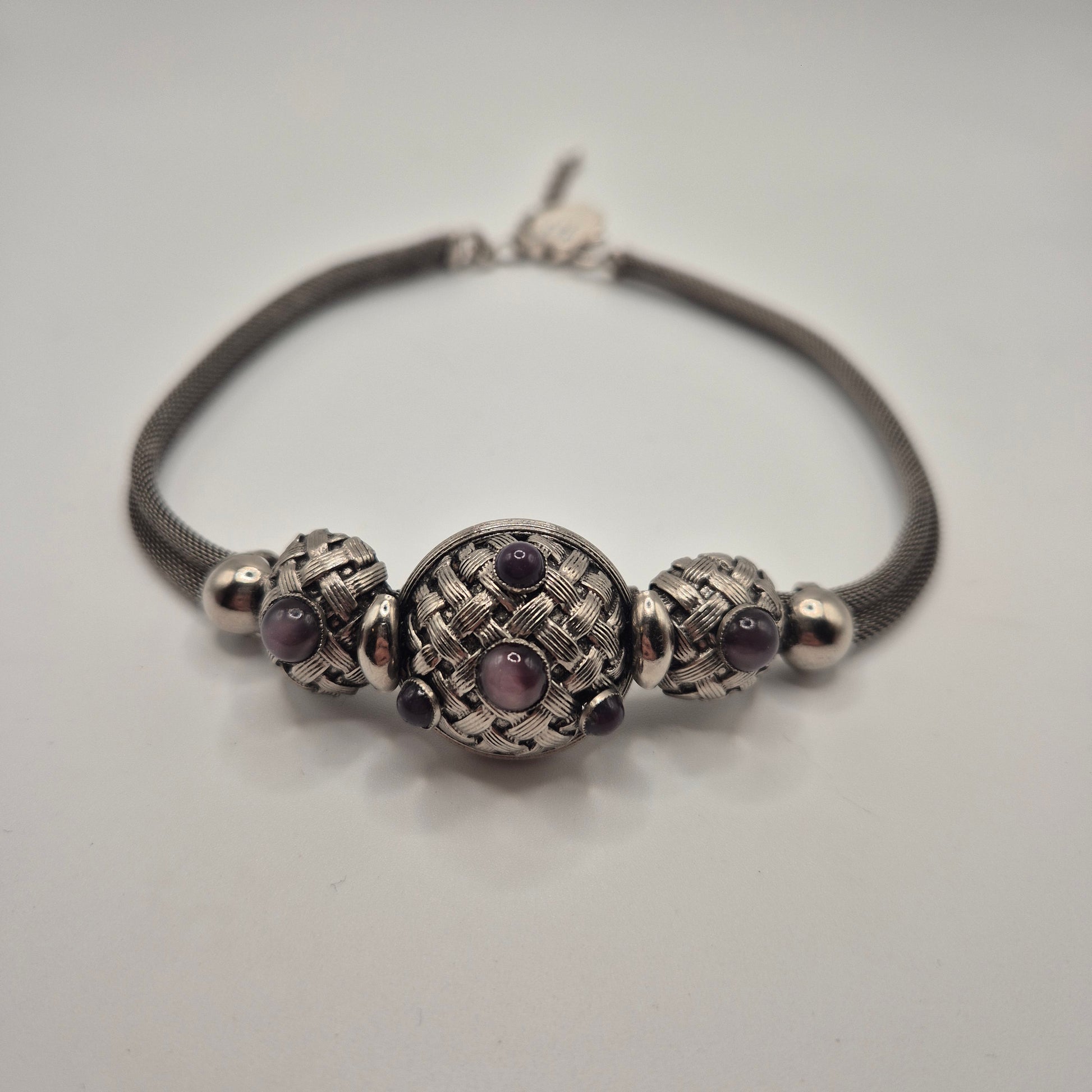 Vintage 80er Jahre Mesh Chocker Silberfarbend mit Lila Stein Cabochon Stil