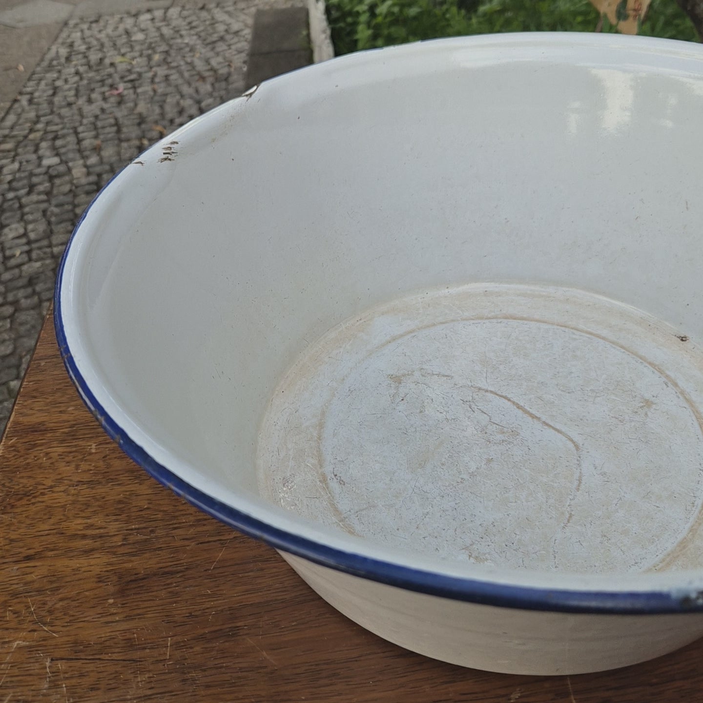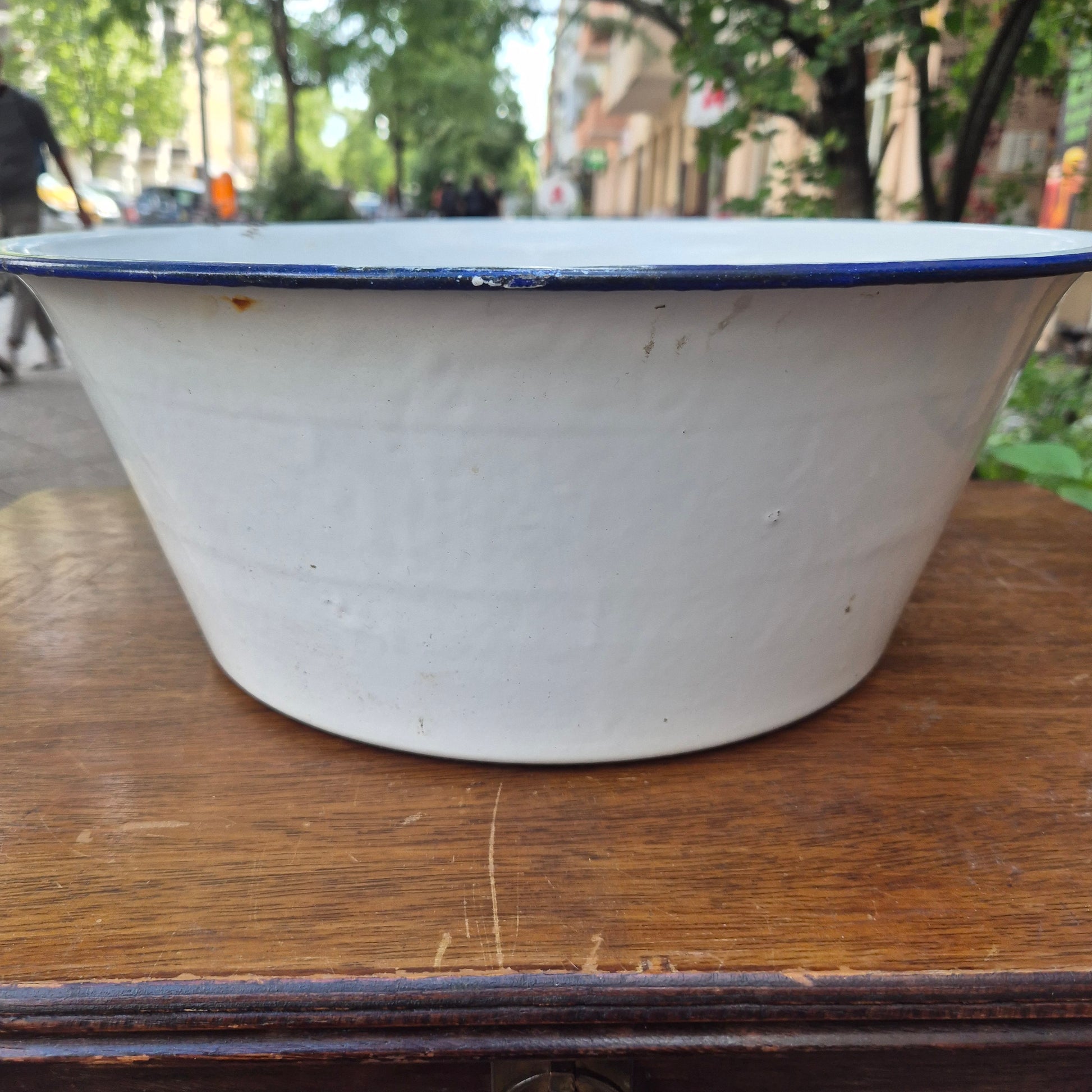 Diese große, alte Waschschüssel aus Emaille in Weiß und Blau bringt nostalgischen Charme in jedes Zuhause. Perfekt, um Retro-Flair zu versprühen oder als dekoratives Highlight zu dienen. Robust und vielseitig – ideal für kreative Einsätze oder einfach als Blickfang mit Geschichte. Ein Stück, das Geschichten erzählt und Spaß macht!
