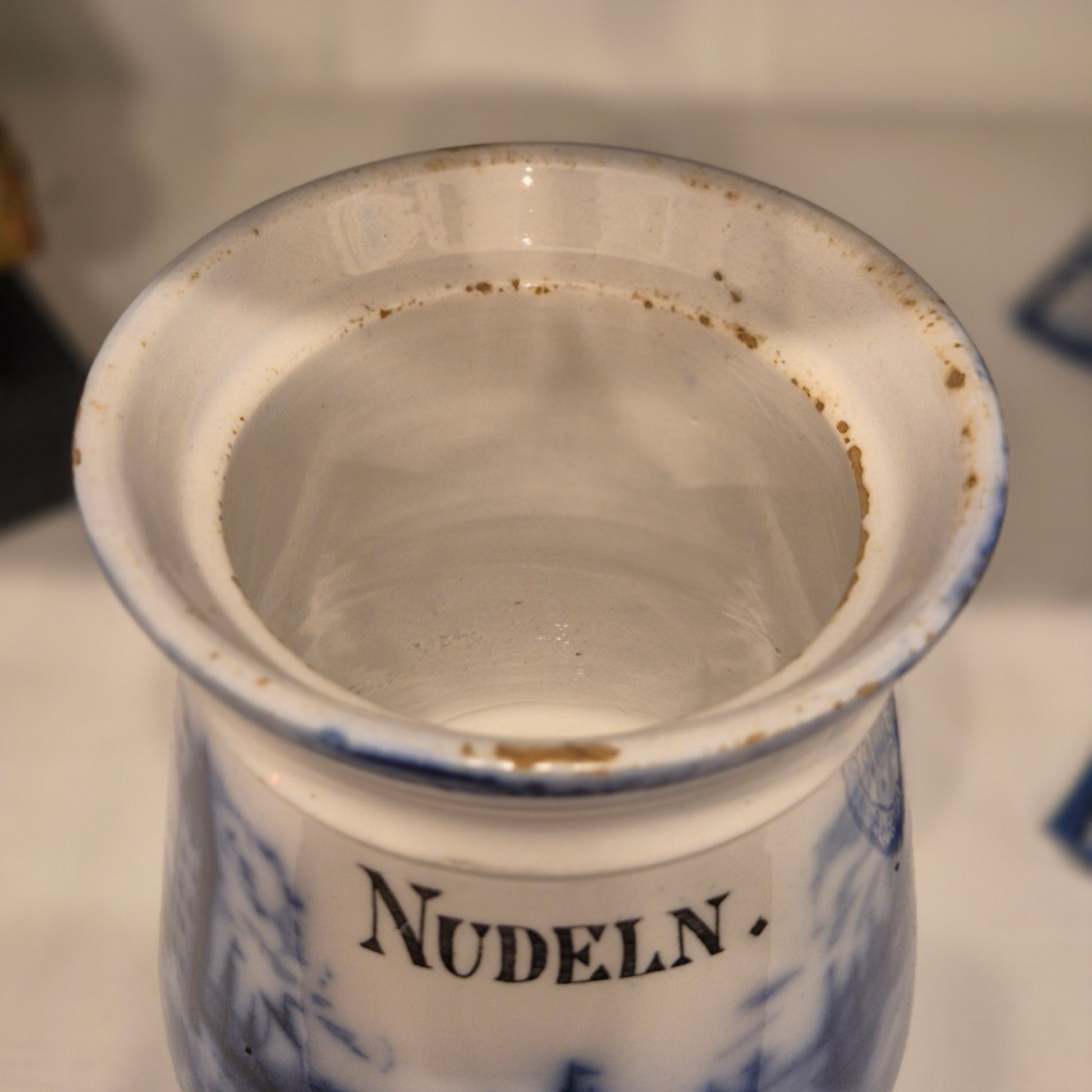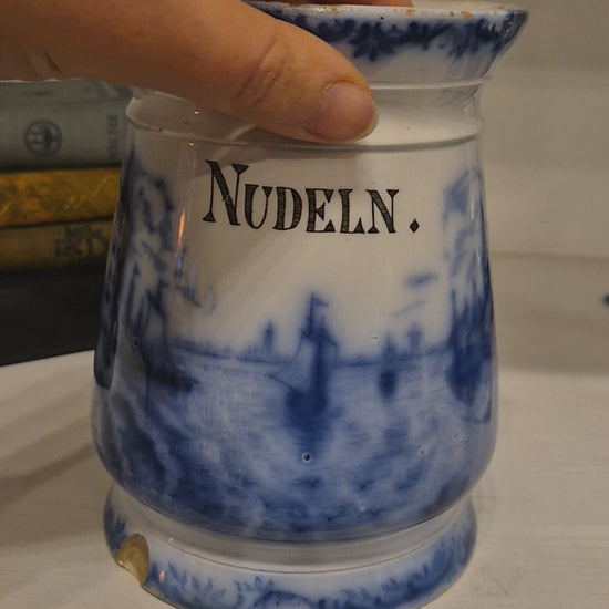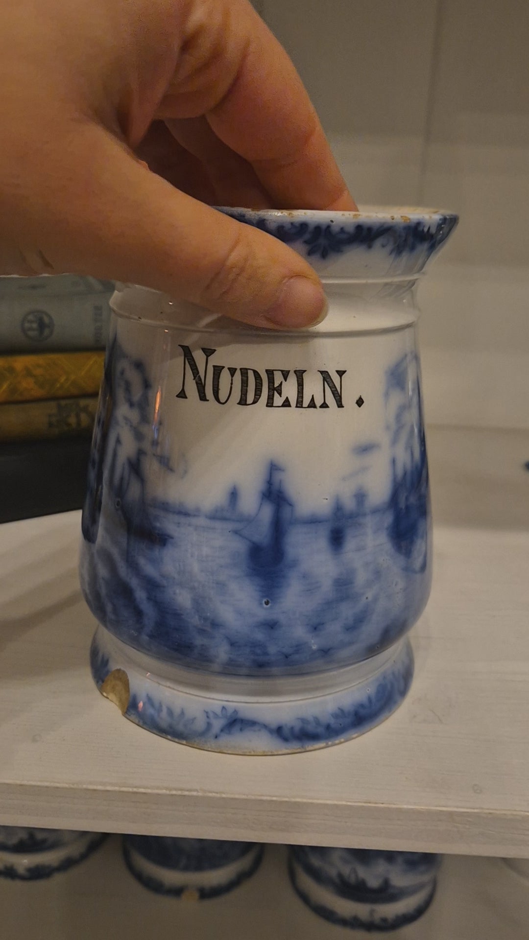 Antike H.H & Cie Delft Vorratsdose ohne Deckel blau weiß 120Jahre alt Kochlöffelhalter Aufschrift "Nudeln"