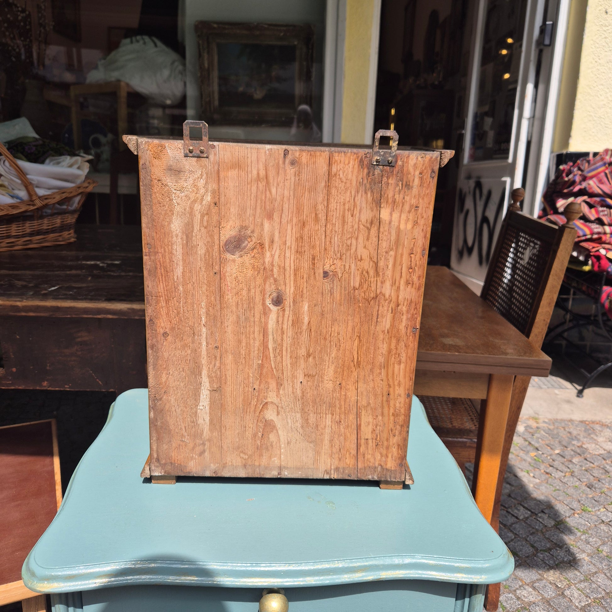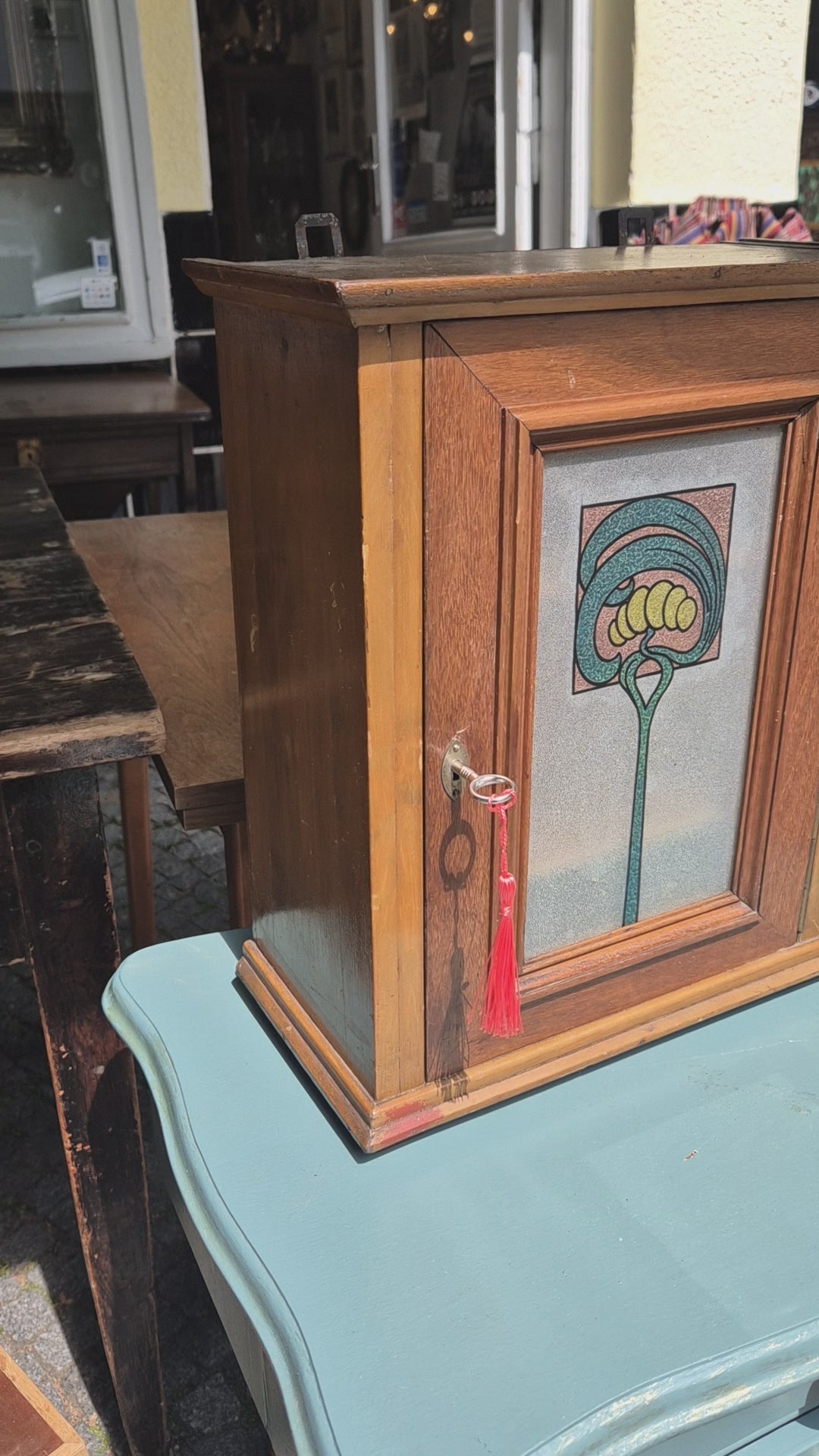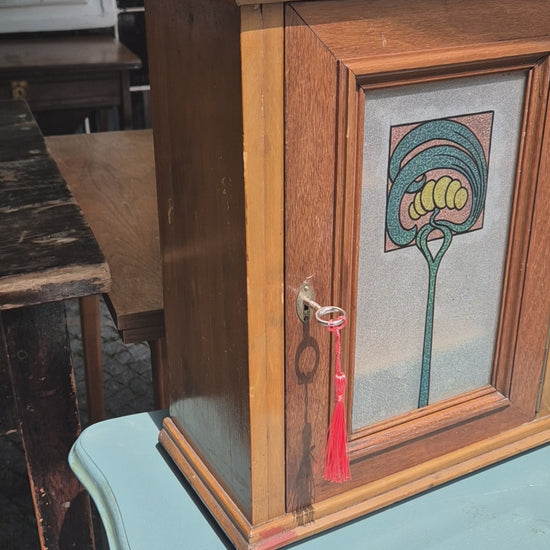 Dieses Jugendstil Hängeschränkchen besticht durch sein originales Glas und verleiht jedem Bad oder Flur einen eleganten, historischen Charme. Ideal als Medizinschrank oder praktischer Aufbewahrungsort, kombiniert es stilvolles Design mit Funktionalität. Ein einzigartiges Möbelstück, das Ihre Einrichtung aufwertet und zugleich Ordnung schafft.