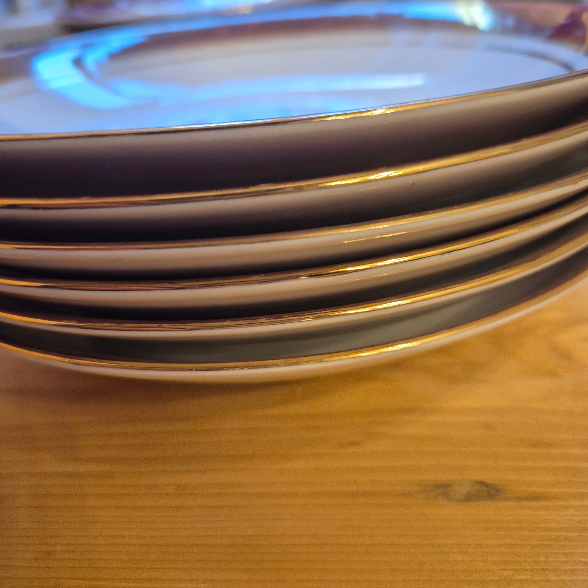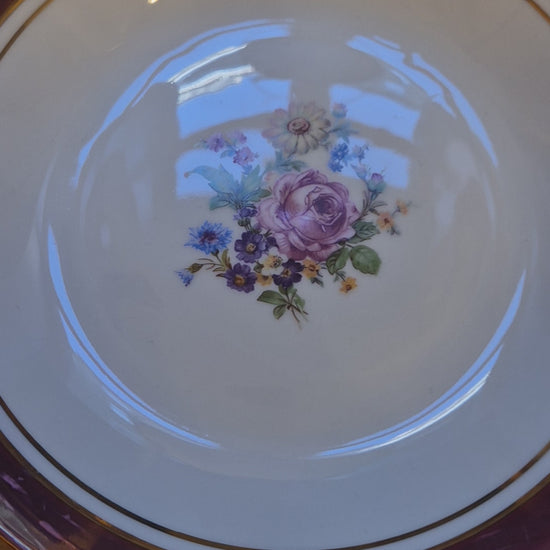 6x Antike tiefe Speiseteller Blumendekor weiß mit lila Goldrand