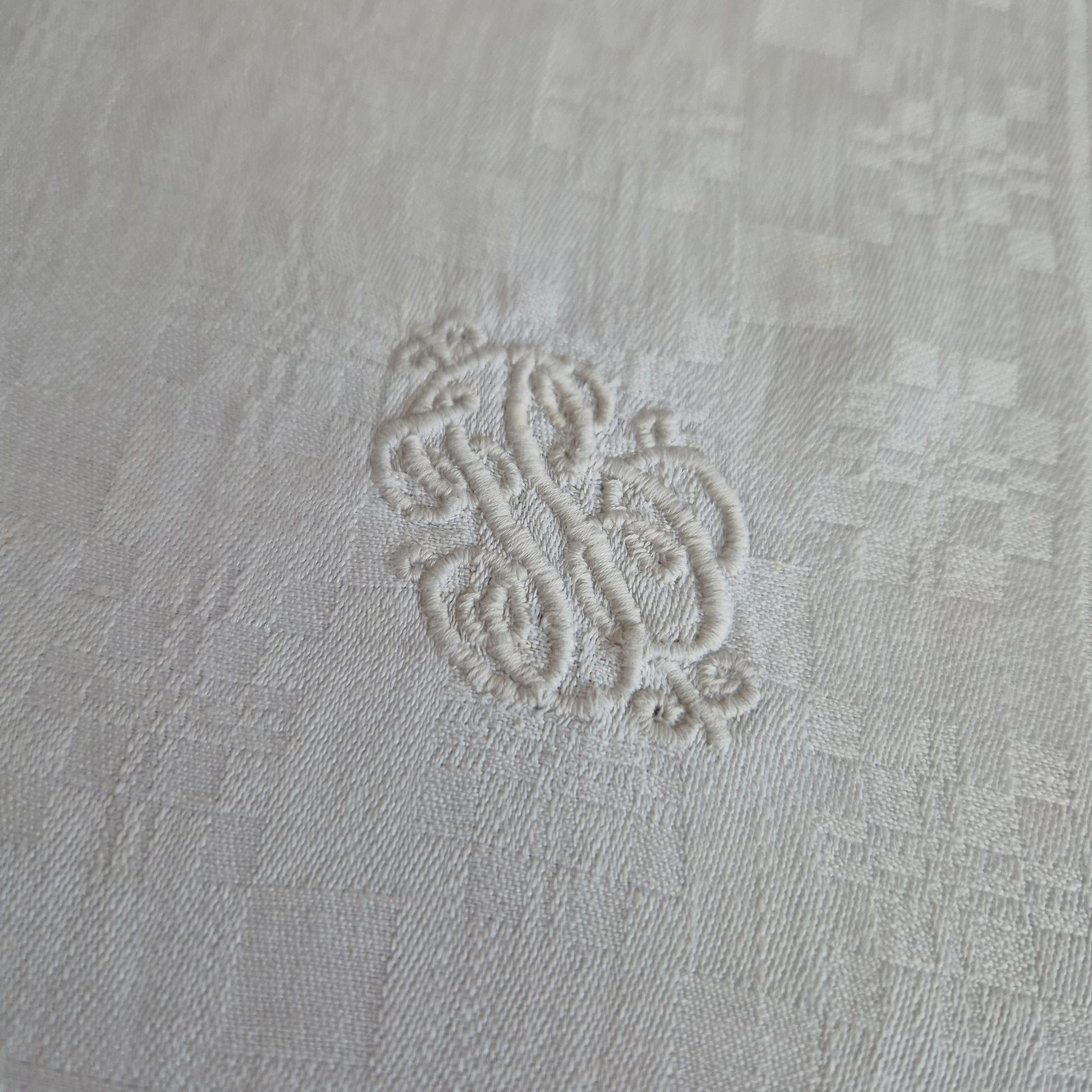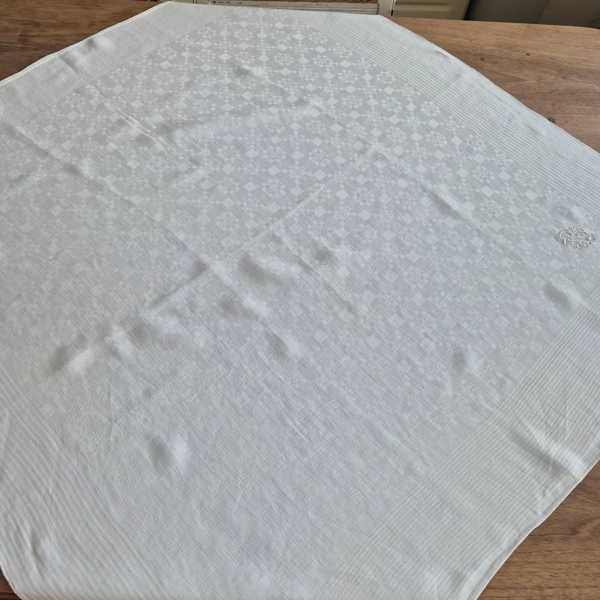 Antike Jugendstil Mitteldecke Tischdecke weiß 89x87cm Monogramm J.B. Damast Stockflecken
