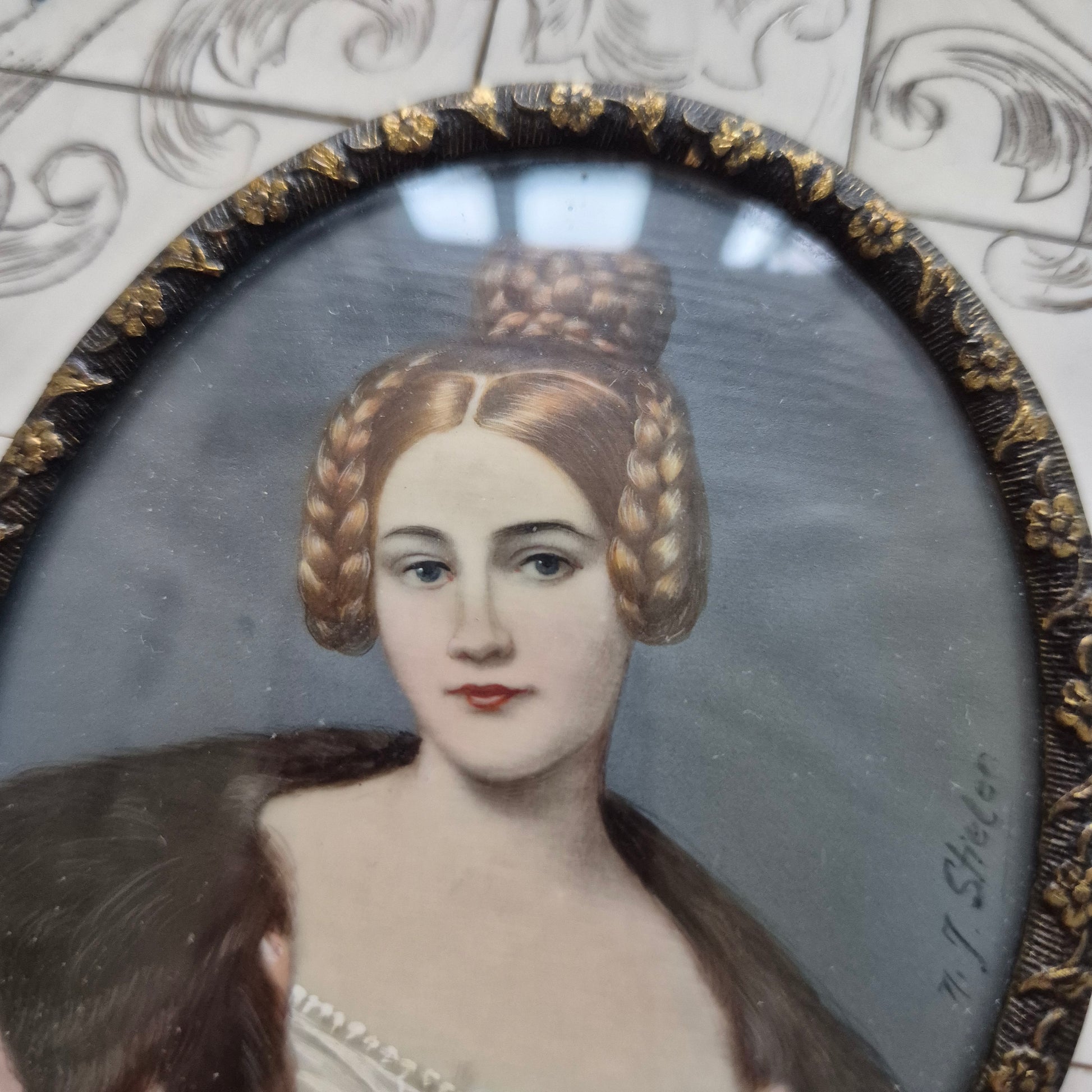 Seltene viktorianische Miniaturmalerei aus dem 19. Jahrhundert mit dem Porträt der Caroline von Holnstein. Die meisterhafte Lupenmalerei auf Bein oder Porzellan zeigt die charakteristische Feinheit dieser anspruchsvollen Kunsttechnik. Das Werk ist in einem Holzrahmen mit Beinbeschlägen gefasst. Das Stück weist altersgerechte Gebrauchsspuren auf – eine Ecke des Rahmens ist gelöst, was dem Objekt authentischen Patina-Charakter verleiht. Ein bedeutsames Sammlerstück für Kenner antiker Miniaturen und viktorianischer Kunsthandwerkskunst mit unverfälschter historischer Provenienz.