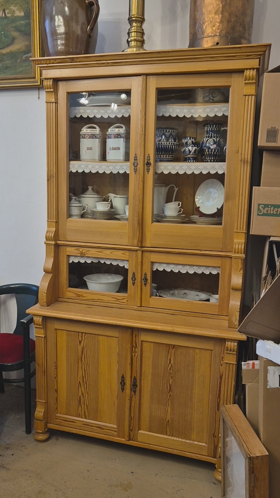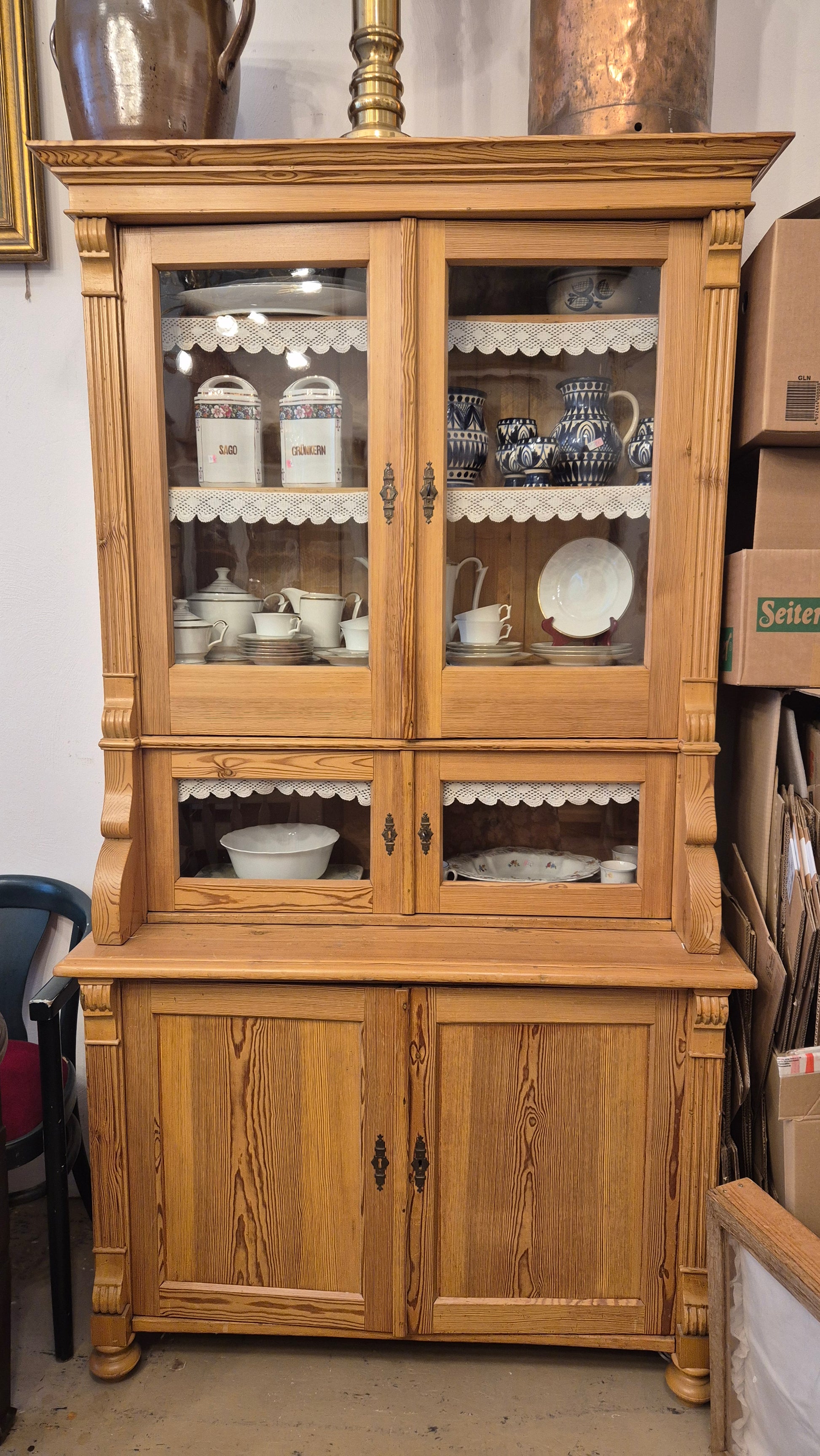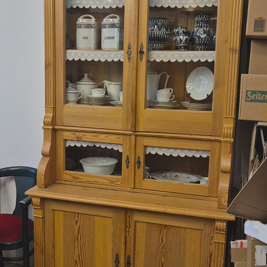 Dieses antike Jugendstil Küchenbuffet aus massivem Kiefernholz verleiht Ihrem Landhaus-Ambiente authentischen Charme. Die zeitlose Handwerkskunst vergangener Epochen macht dieses Vollholzmöbelstück nicht nur zu einem funktionalen Stauraum, sondern zum echten Blickfang in Ihrer Küche. Investieren Sie in ein Stück Geschichte, das Generationen überdauert.