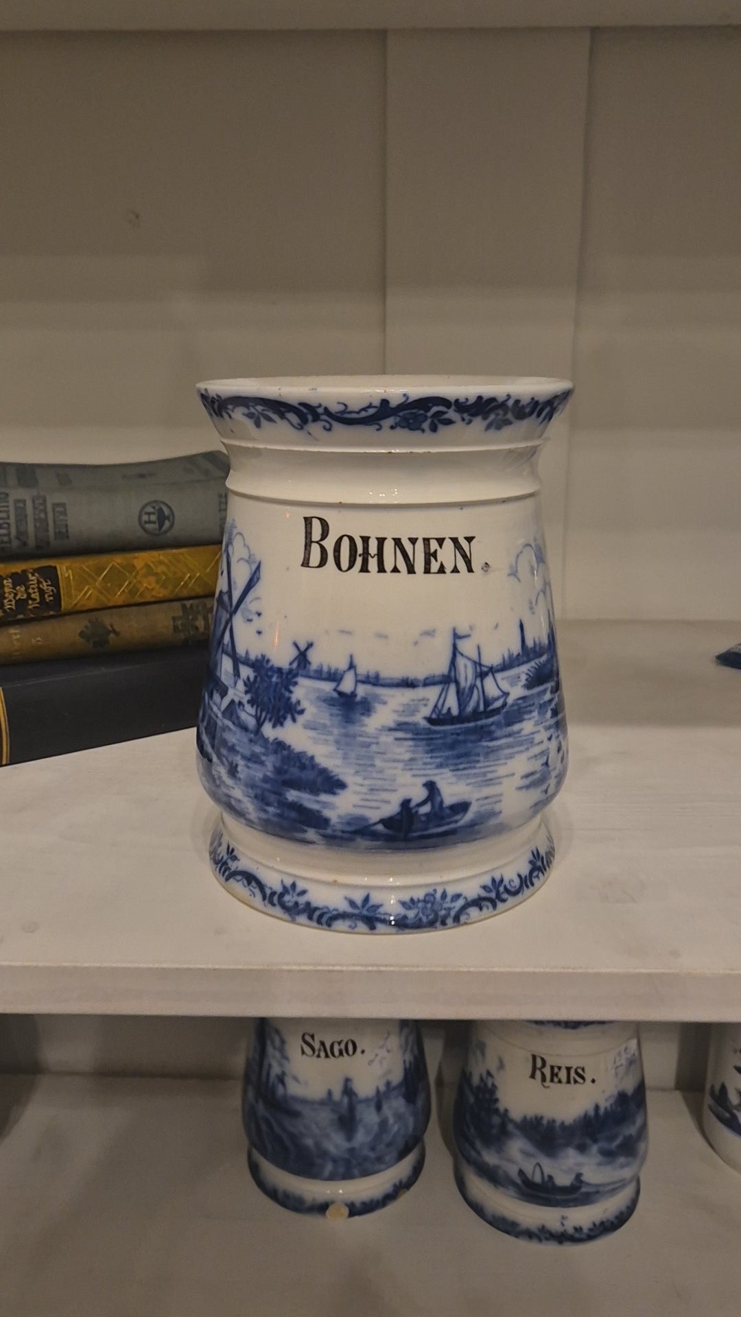 Antike H.H & Cie Delft Vorratsdose ohne Deckel blau weiß 120Jahre alt Kochlöffelhalter Aufschrift "Bohnen"