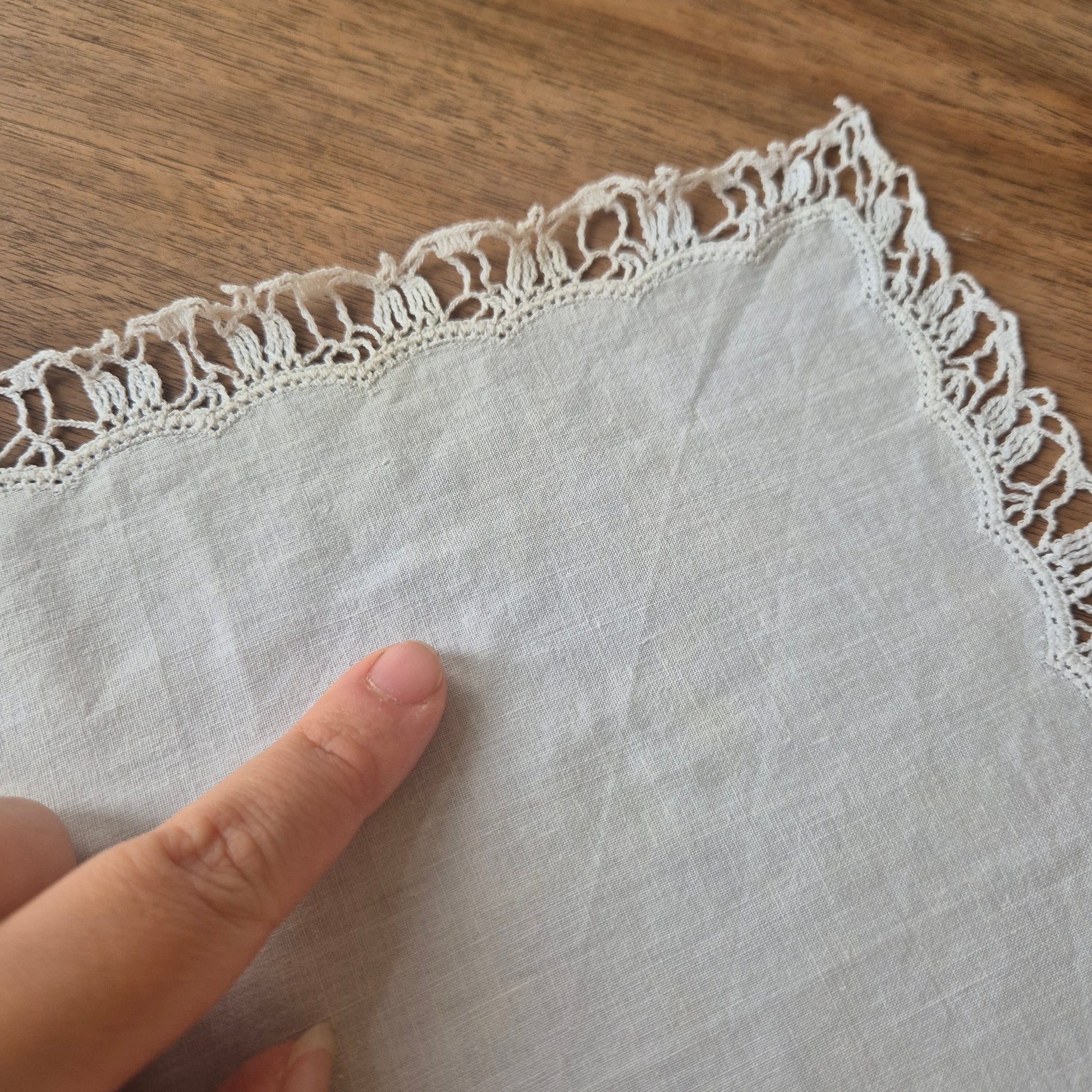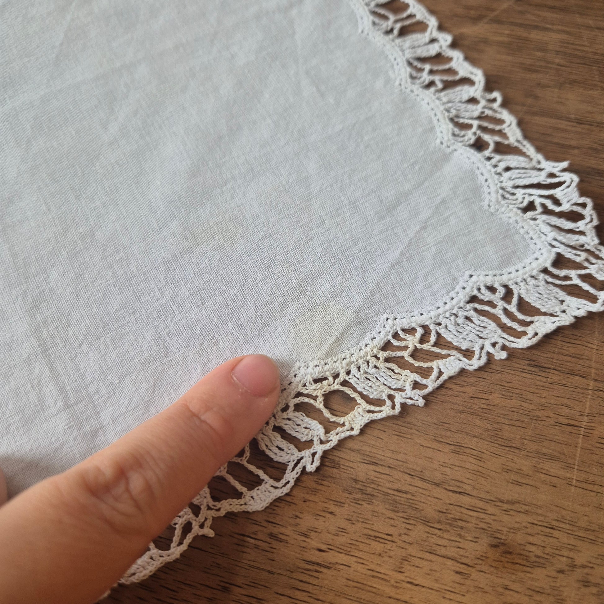 Dieses charmante Vintage-Stofftaschentuch aus weißer Baumwolle vereint zarte Stickereien mit liebevollem Häkeln und Klöppeln. Mit einer Größe von 28x28 cm ist es perfekt für nostalgische Momente oder als verspieltes Accessoire. Kleine Flecken erzählen seine Geschichte und machen es einzigartig – ein charmanter Fund für Liebhaberinnen besonderer Details!