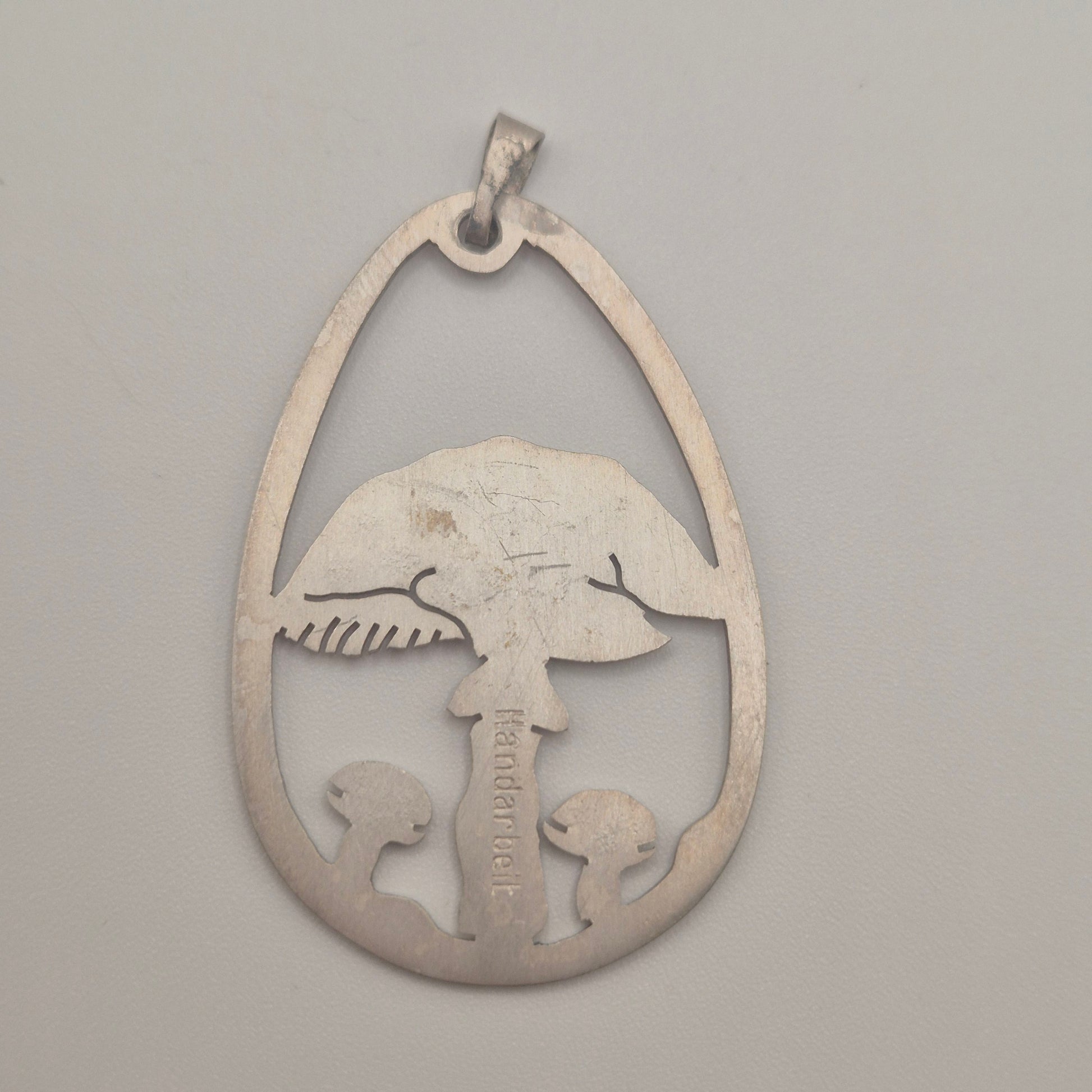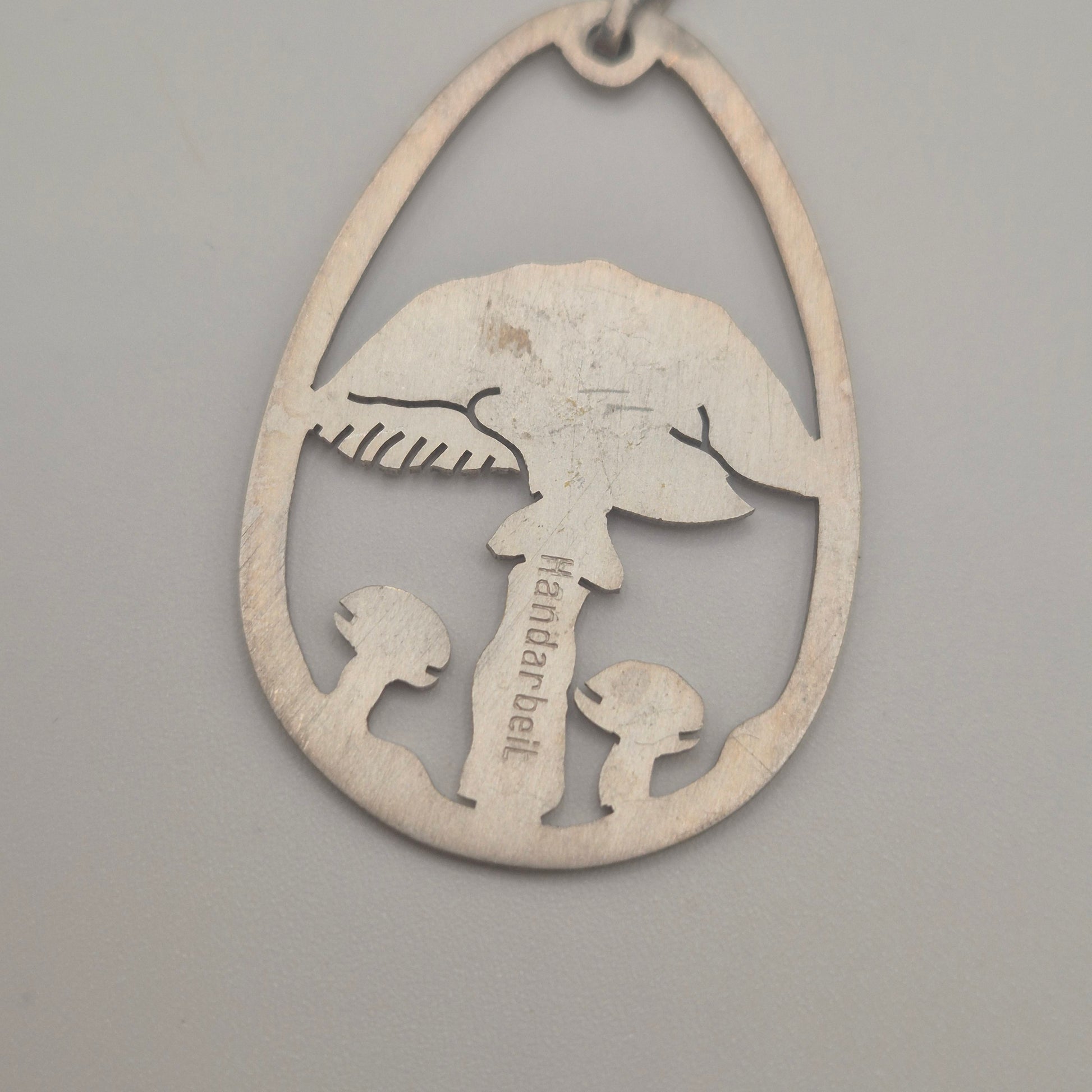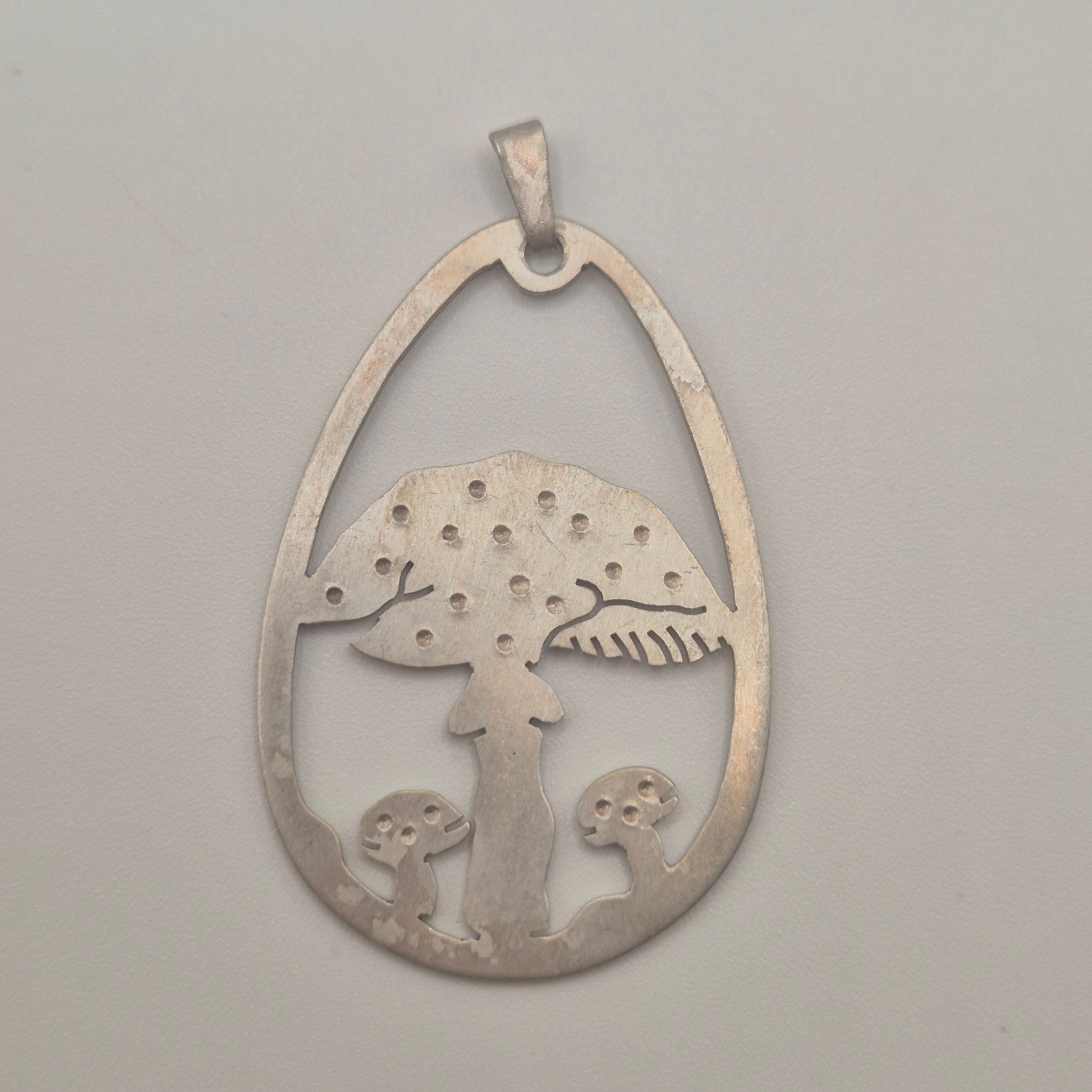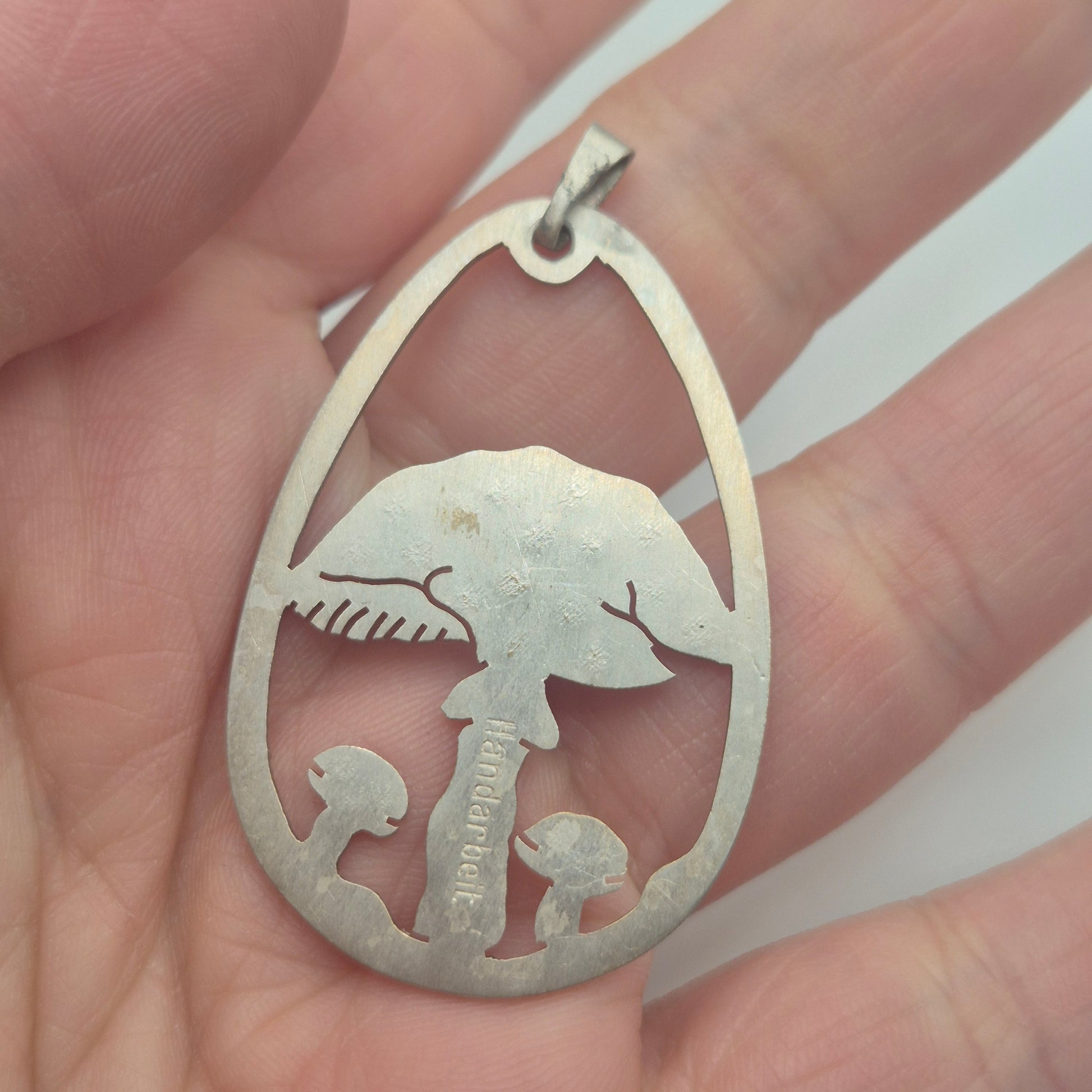 Ein echtes Unikat für Naturgeister! Dieser wunderschöne, handgearbeitete Anhänger zeigt ein detailreiches Pilz-Motiv in einer eleganten Tropfenform. Perfekt für alle, die das Besondere suchen. Filigrane Cut-Out Arbeit (ausgesägtes Motiv), die einen großen und einen kleinen Pilz darstellt. Cottagecore / Boho / Nature-Vibe. ✨ Silberfarben mit einer schönen, authentischen Patina. Sehr guter Vintage-Zustand, stabil verarbeitet.Sieht toll an einer langen Silberkette oder einem schlichten Lederband aus.