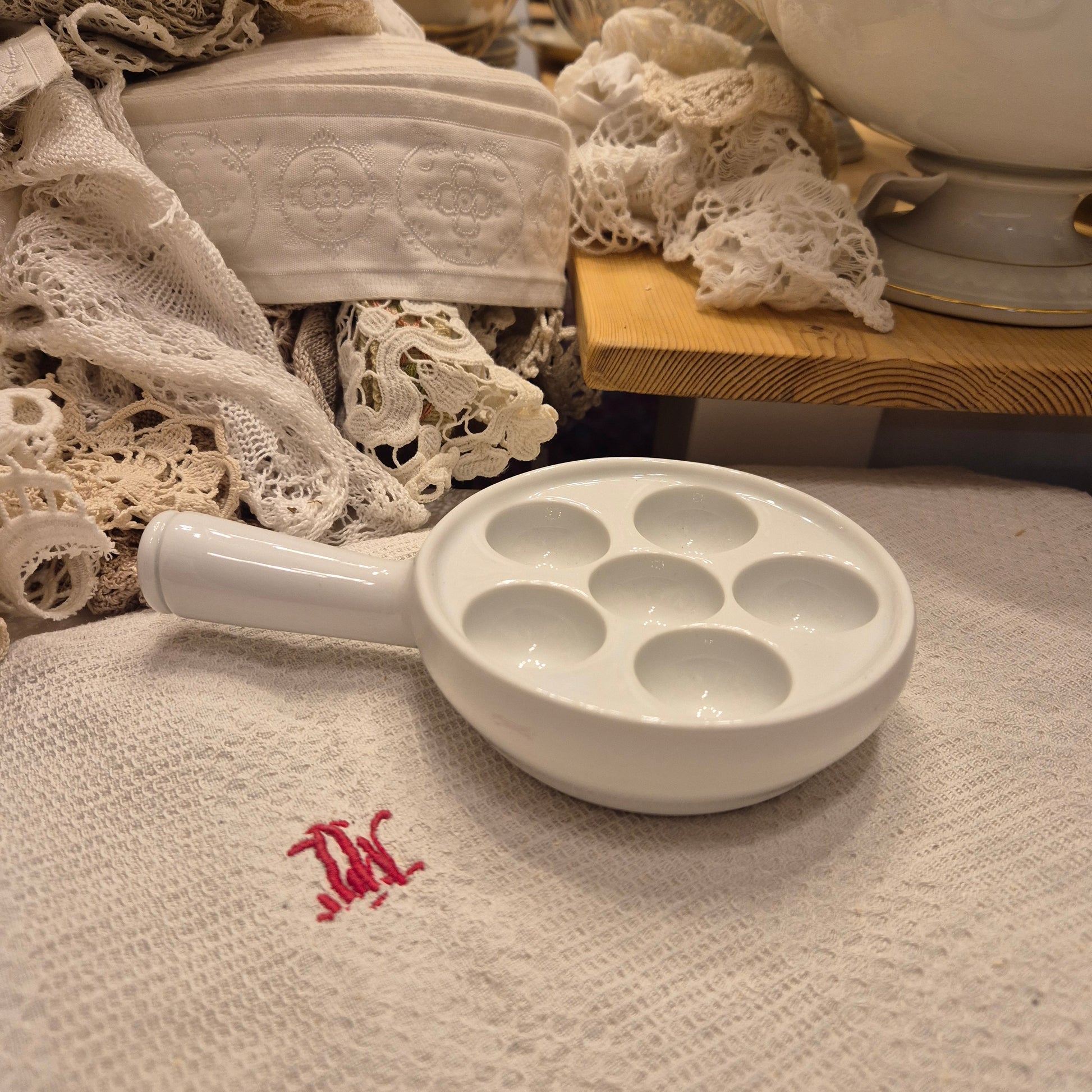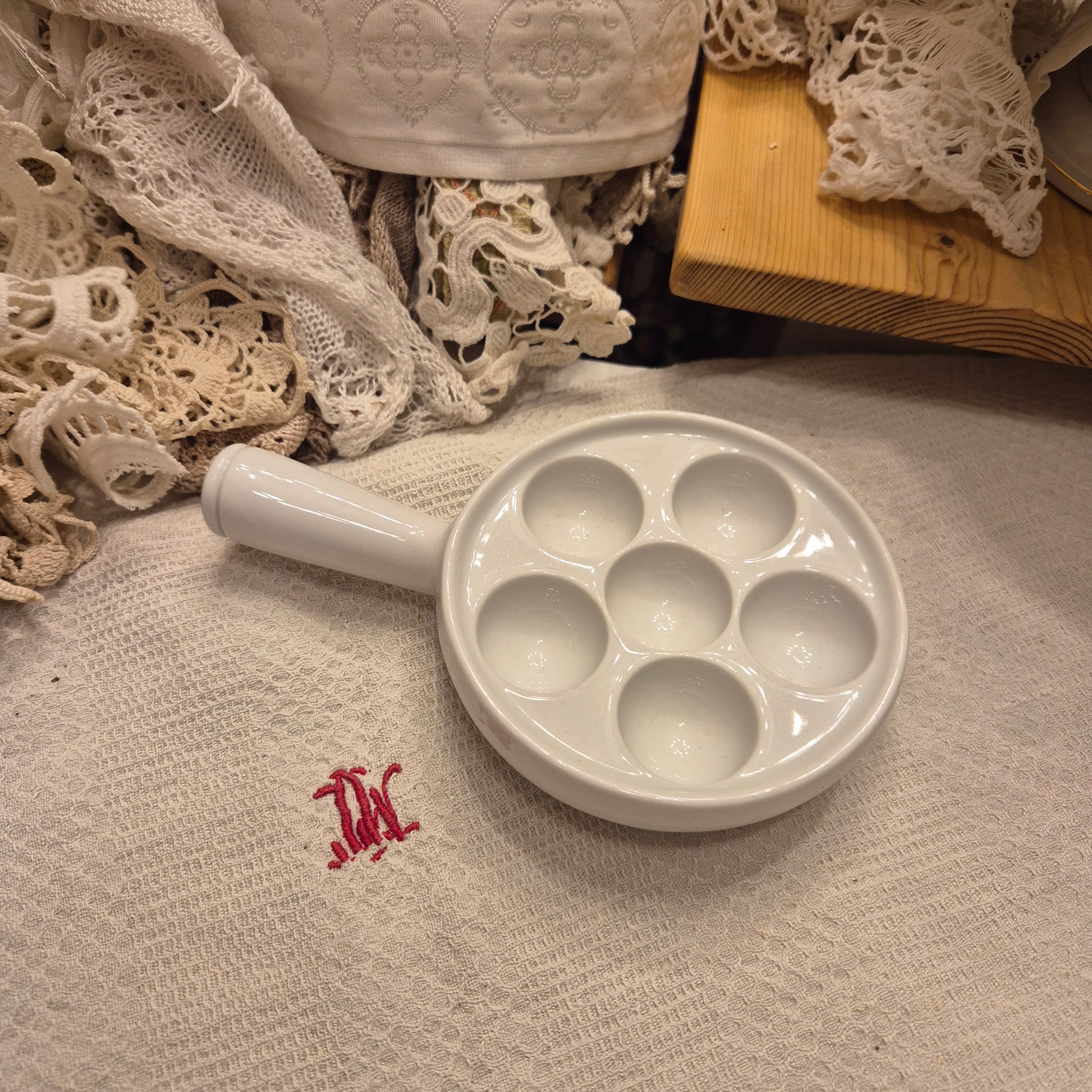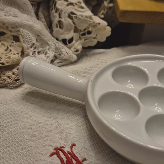 Antike Pillivuyt Schneckenpfanne 6 Augen Vintage Eierplatte Eierteller Porzellan weiß