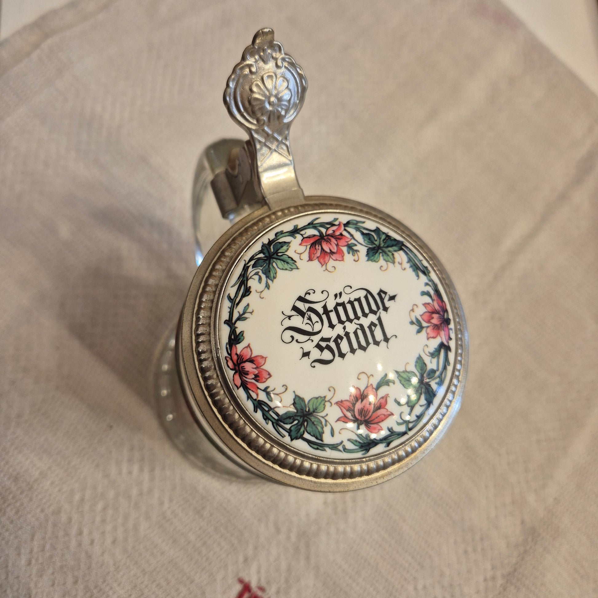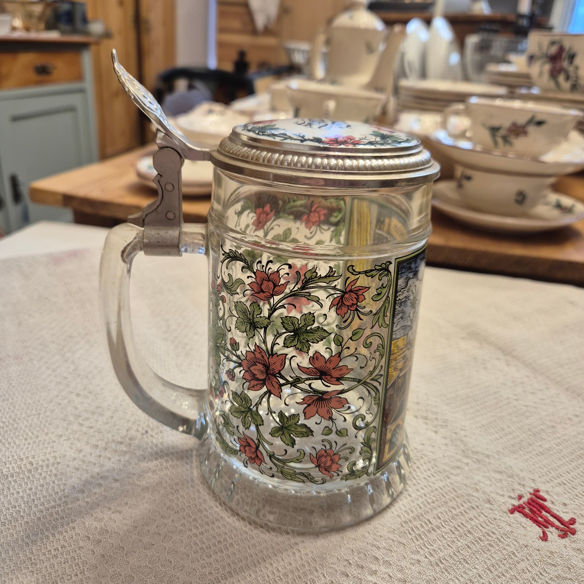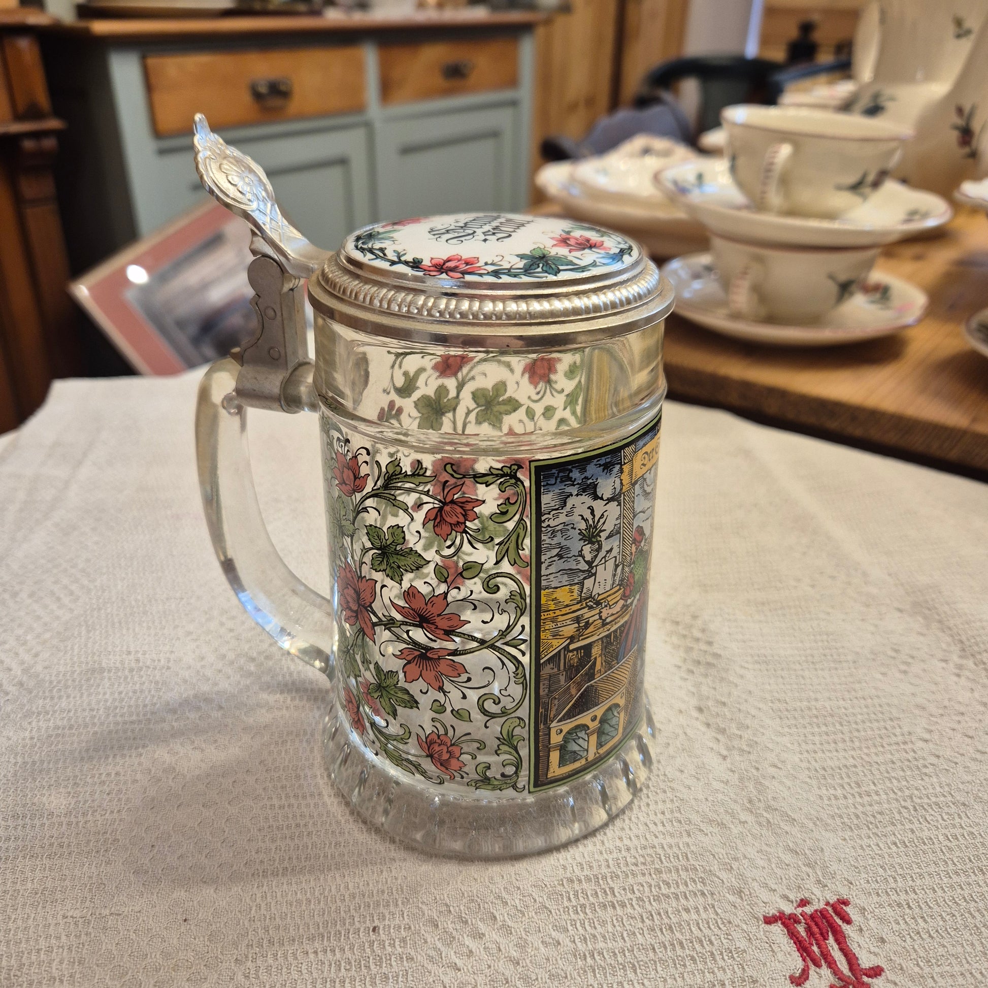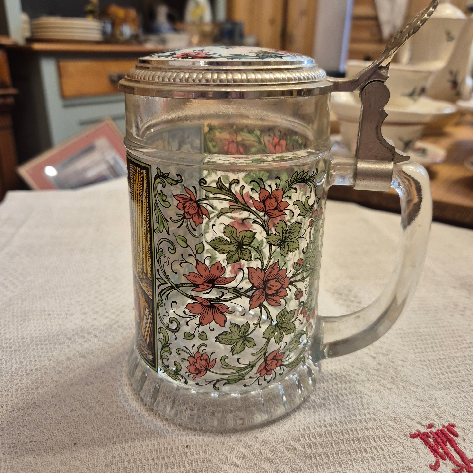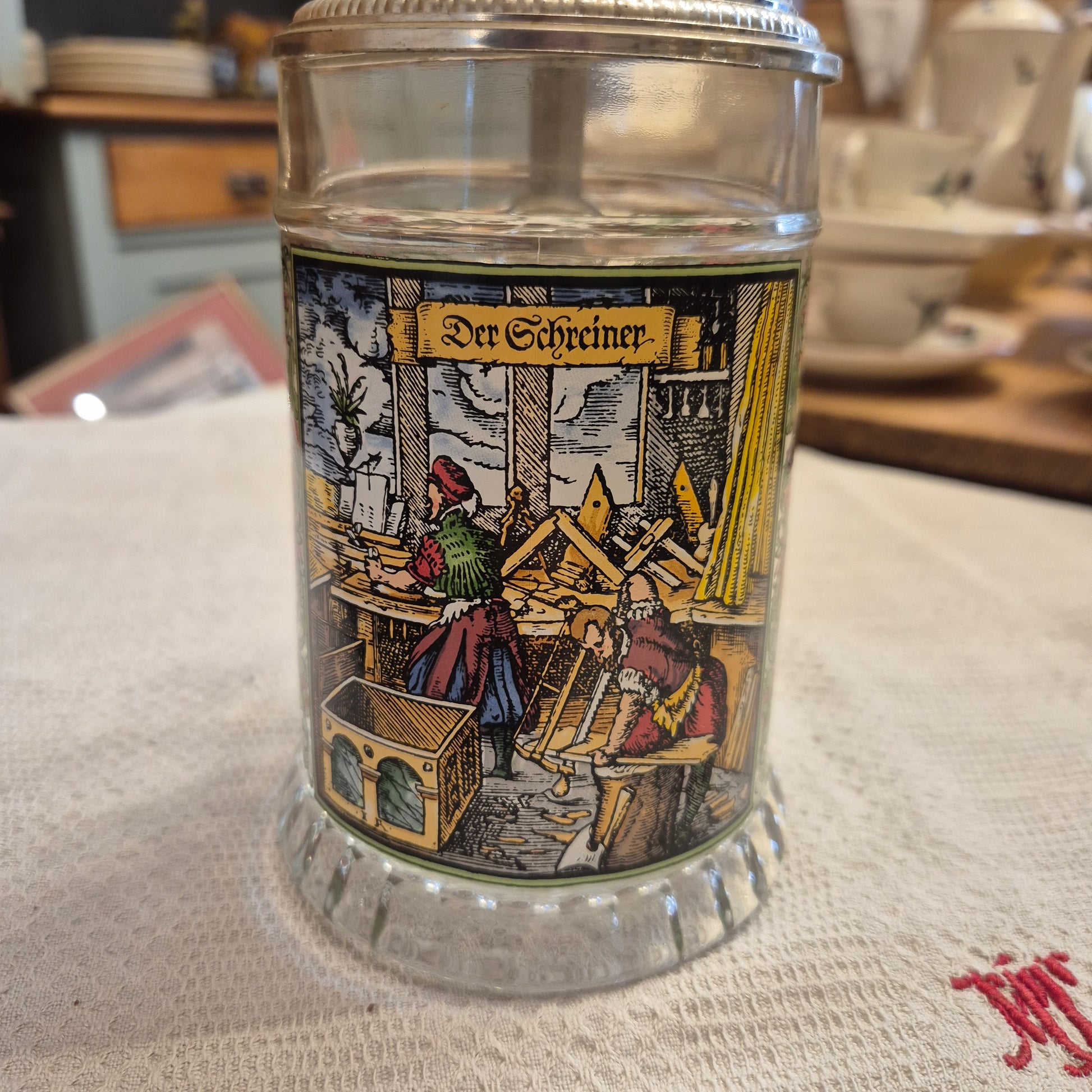 Vintage Glas Bierkrug mit Deckel Geschenk Der Schreiner Motiv