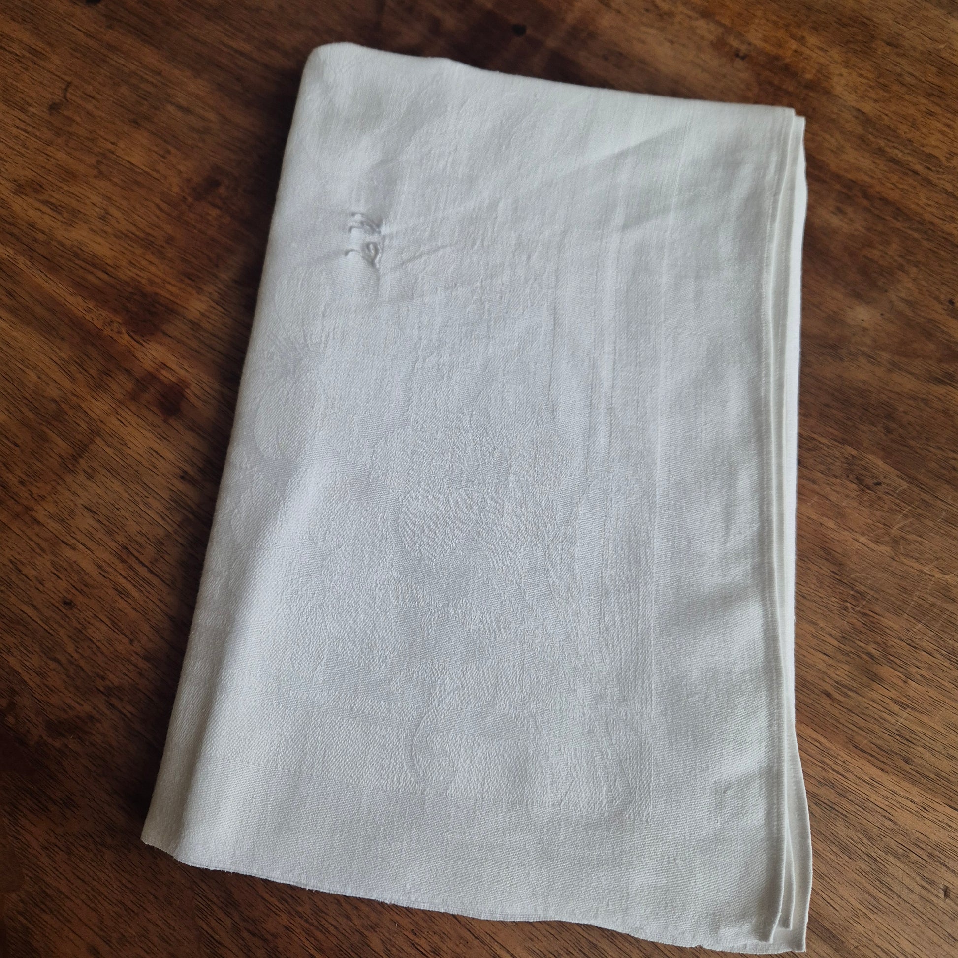 Vintage Tischdecke weiß 129x131cm Damast weiß Minimale Stockflecken