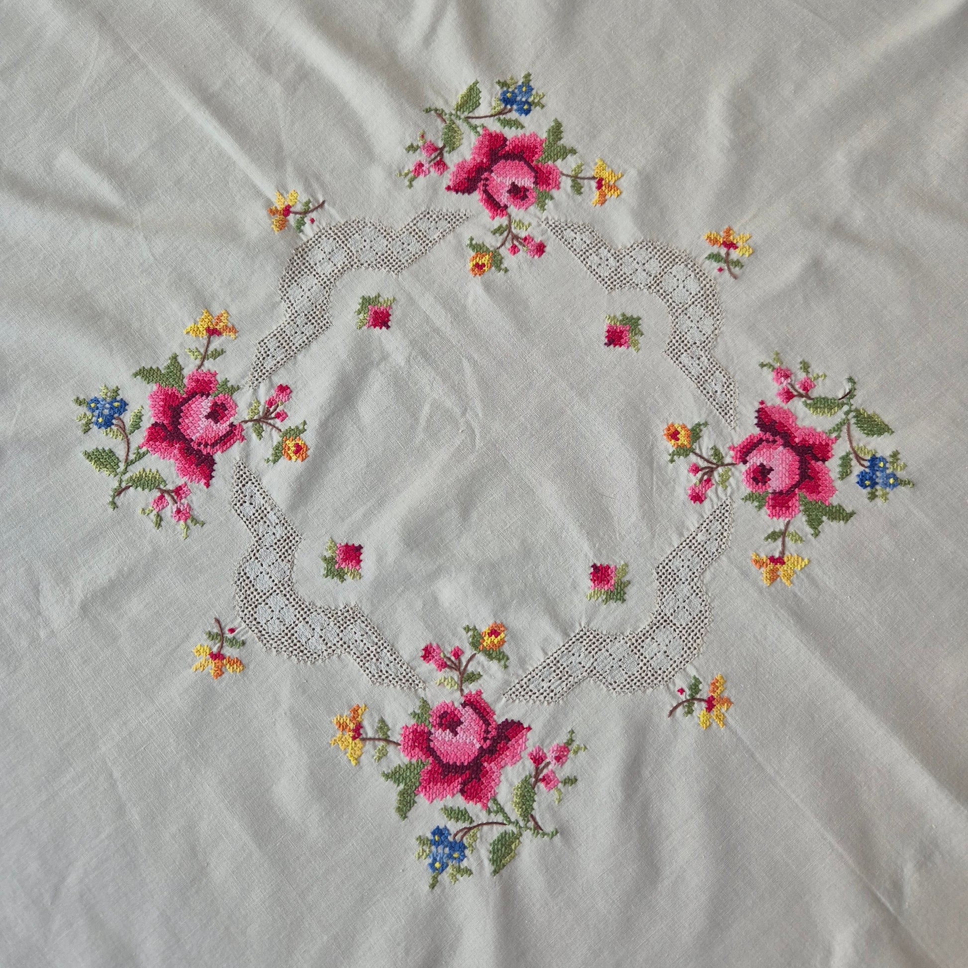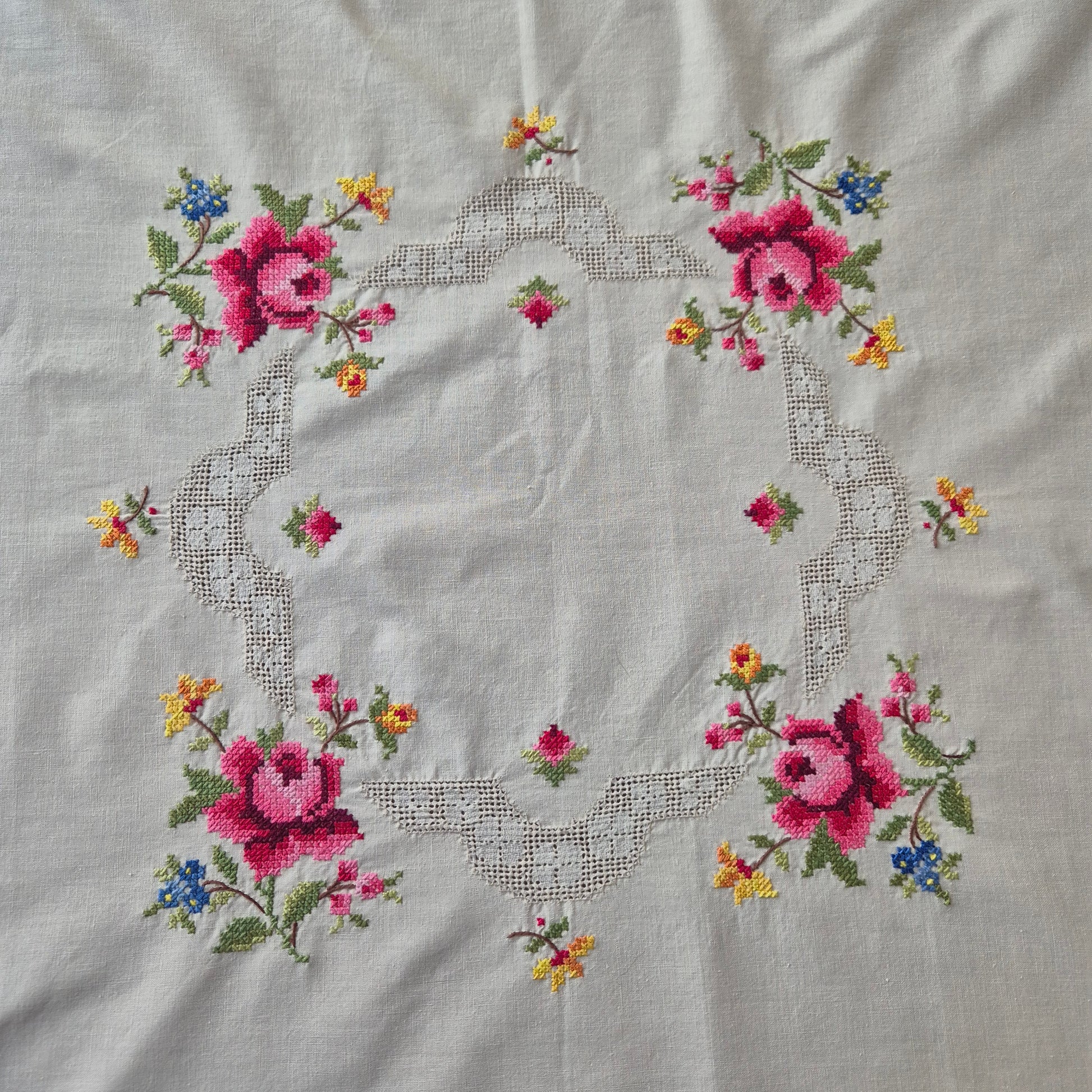 Diese entzückende antike Vintage-Mitteldecke in Creme-Beige verzaubert mit zarten, bestickten Rosen und misst 80x85 cm. Perfekt, um Ihrem Tisch einen charmanten und verspielten Akzent zu verleihen – ideal für gemütliche Nachmittage oder besondere Anlässe mit einer nostalgischen Note!