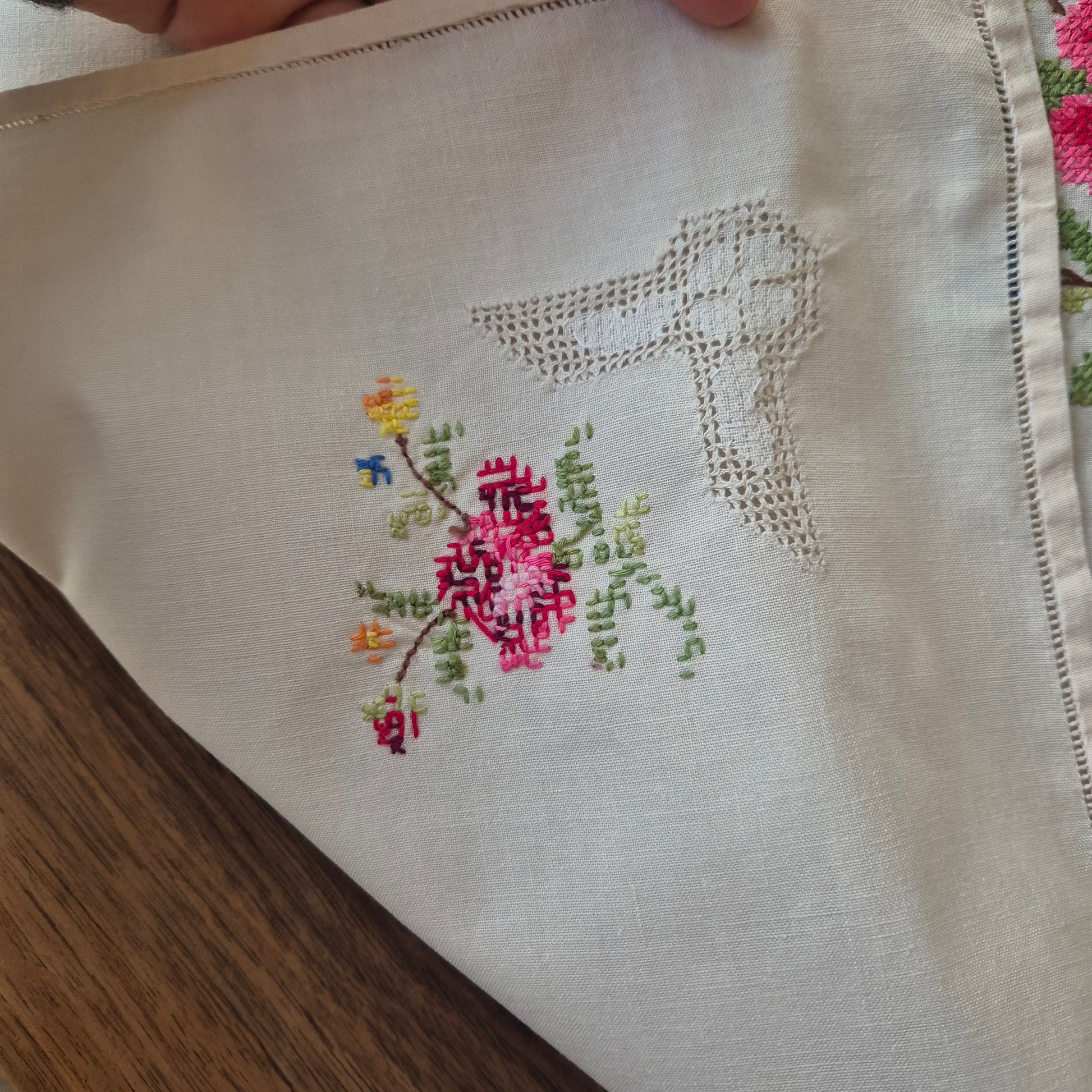 Antike Vintage Mitteldecke Tischdecke creme beige 80x85cm bestickt mit Rosen