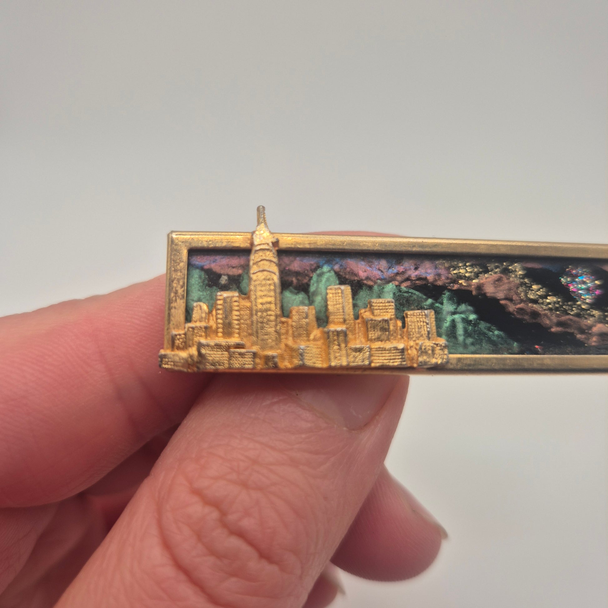 Eine reliefartige, goldfarbene Skyline-Silhouette, unverkennbar mit dem Empire State Building, erhebt sich vor einem faszinierenden, kosmisch anmutenden Hintergrund. Der Hintergrund besteht aus einem Mixed-Media-Feld mit tiefvioletten und grünen Farbtönen, verziert mit feinem Glitzerstaub und kleinen, funkelnden "Sternen"-Steinchen. Ein goldfarbener Rahmen fasst das Kunstwerk ein. Ein ideales Statement-Piece für Revers, Schals, Mützen oder Taschen. Es ist perfekt für Individualisten, Liebhaber von Vintage-Mode und Fans von Stadtlandschaften und Kosmos-Themen. Eine Brosche für Damen und Herren, die das Besondere lieben und auf ausdrucksstarke Accessoires setzen.
