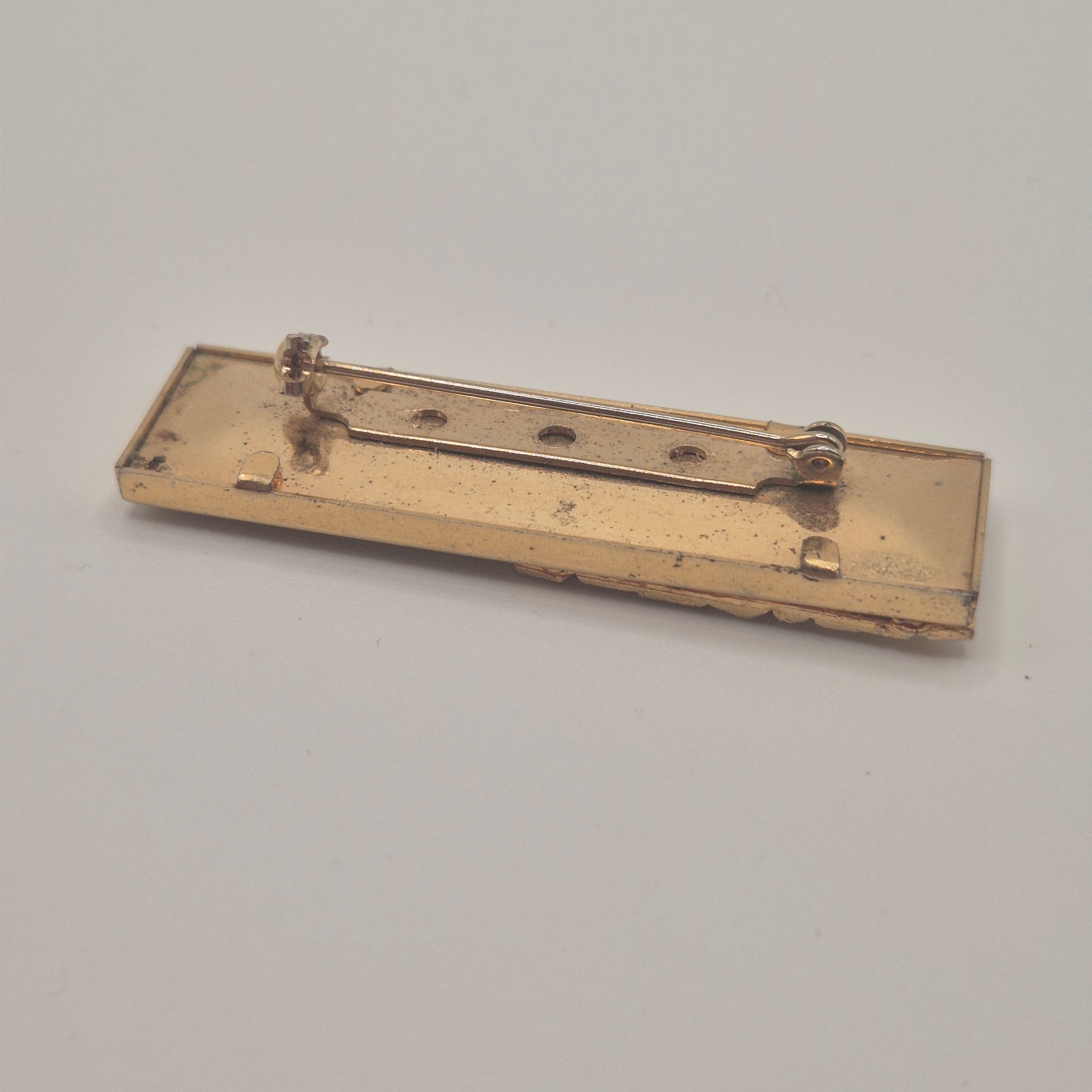 Vintage-Brosche – Goldene Skyline vor kosmischem Hintergrund New York